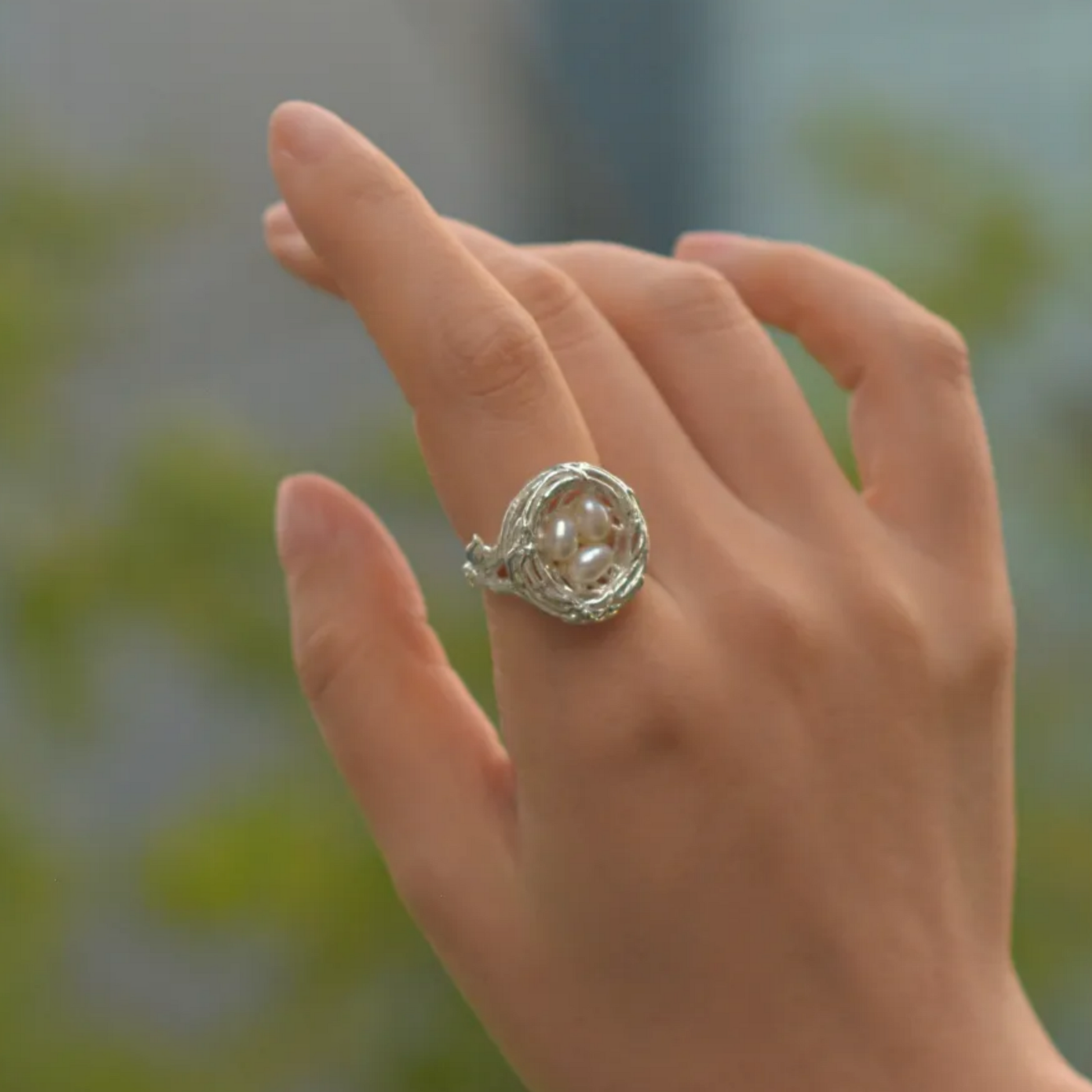 925 Silver Bird Nest Ring | Pearl Nature Jewelry | Handmade Branch Design | Symbol of Home & Love | Gift for Mother or Partner
