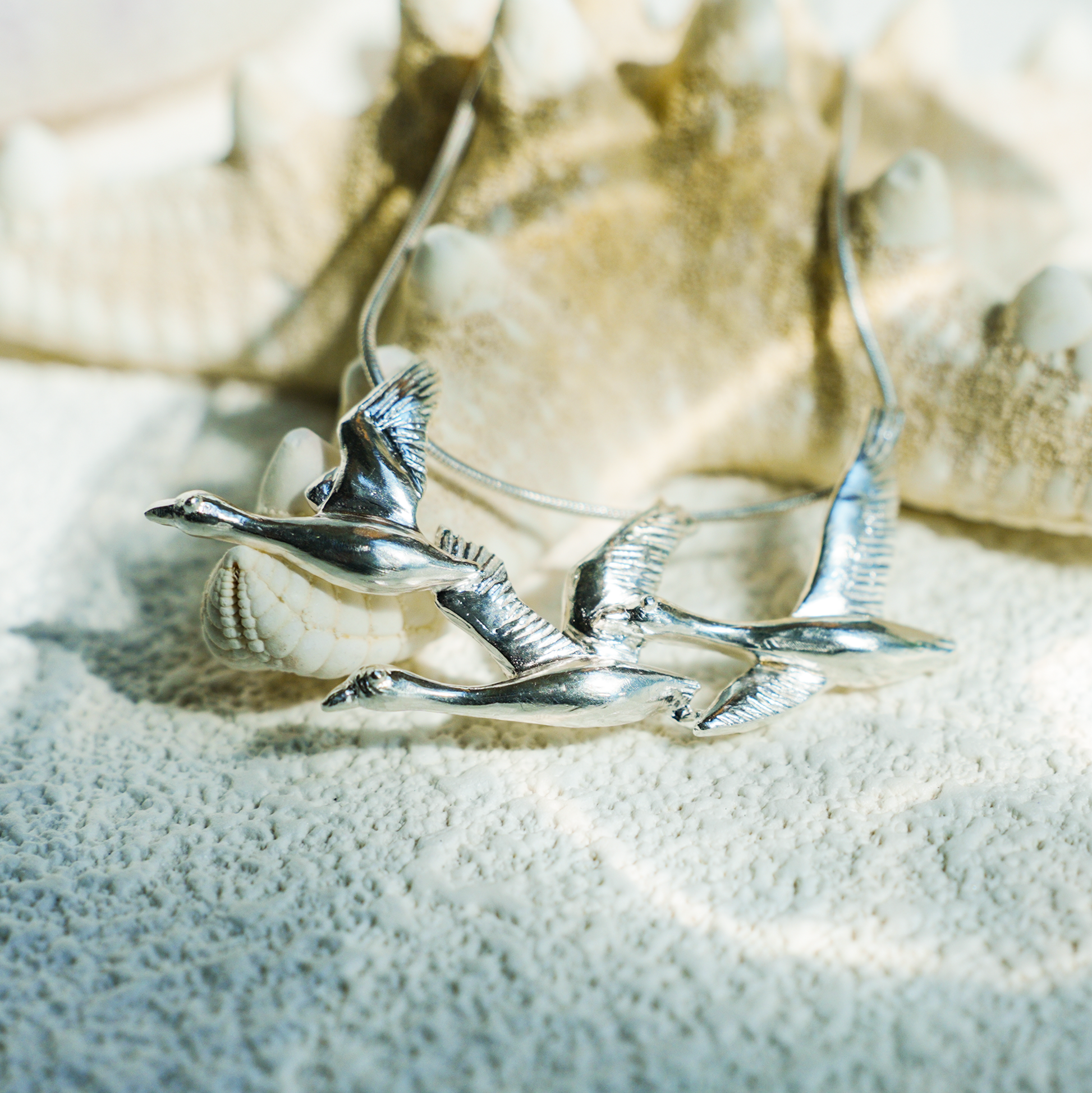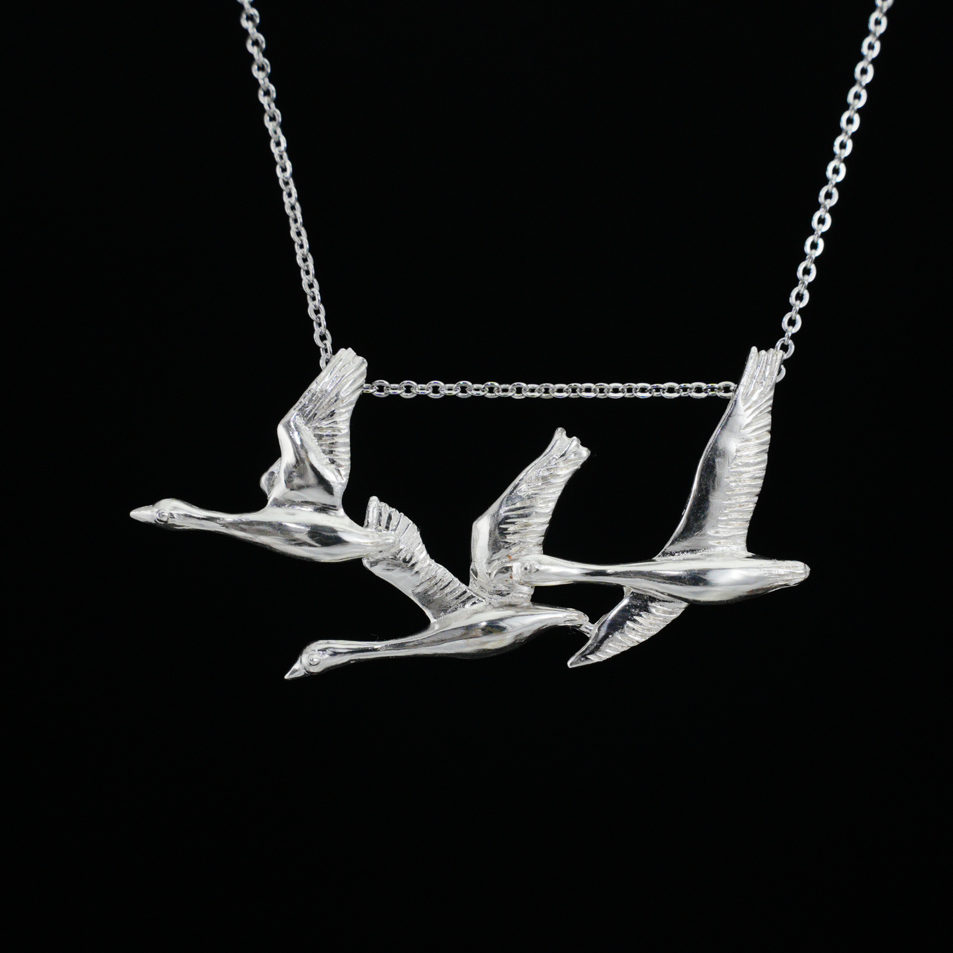 Made from 925 sterling silver, three geese soar together in graceful formation — a symbol of loyalty, companionship, and return. Inspired by nature’s harmony, this design embodies emotional strength and connection across distance and time.