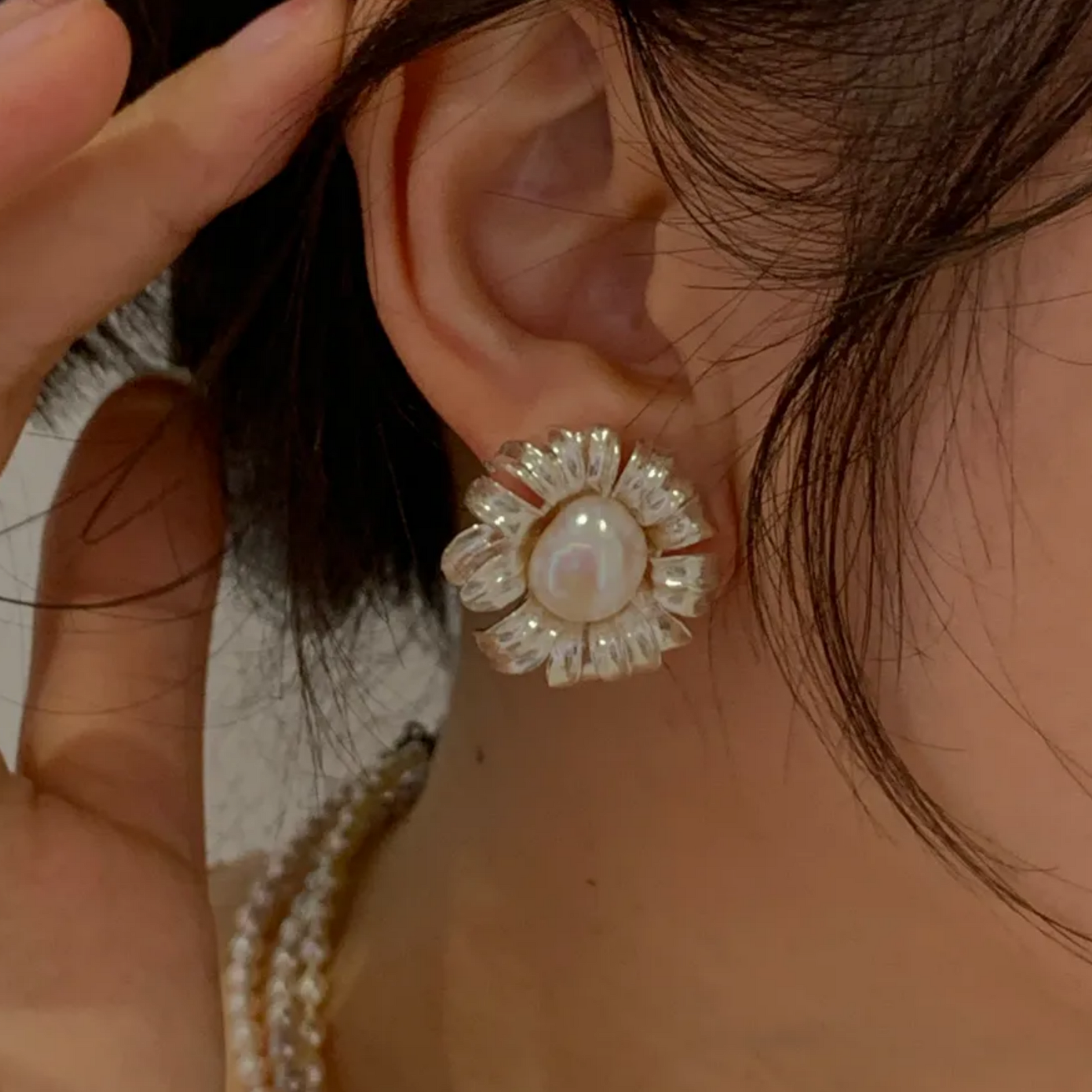 Each silver petal unfurls like sunlight, encircling a soft freshwater pearl that reflects gentle devotion and quiet resilience.