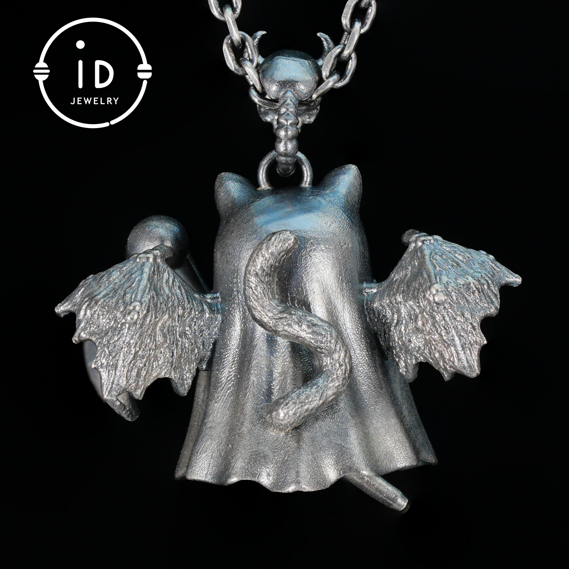 Hand-finished matte textures, sculpted bat wings, cloak and scythe; skull-shaped bail as connector; Chinese inscription on front plate ("Ghost Kitty"), part of the character design with no religious or occult meaning