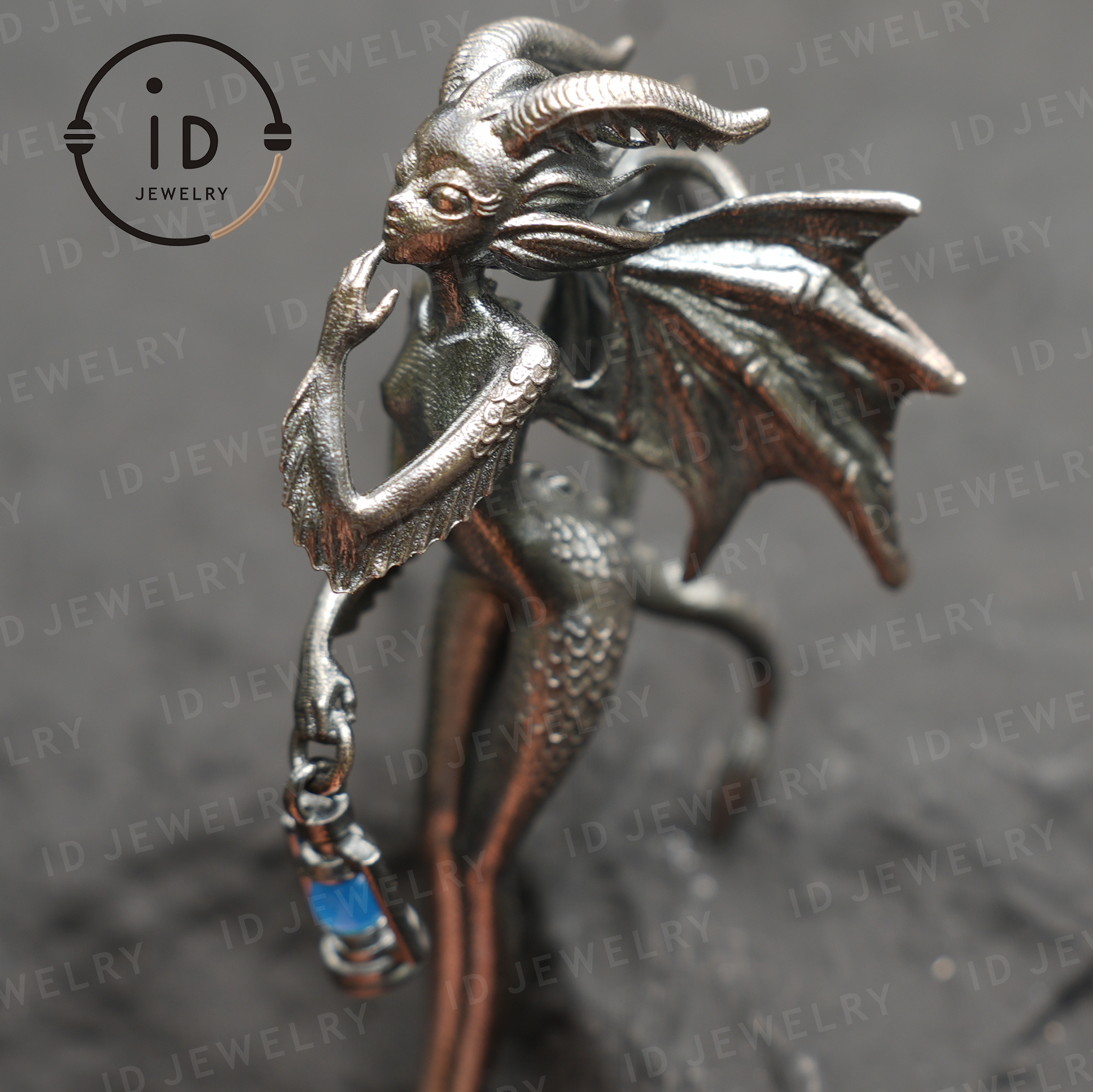 Dragon Girl Holding Lantern | Dragon-Themed Pendant in Hand-Carved Silver | A Fantasy Necklace for Your Inner Journey