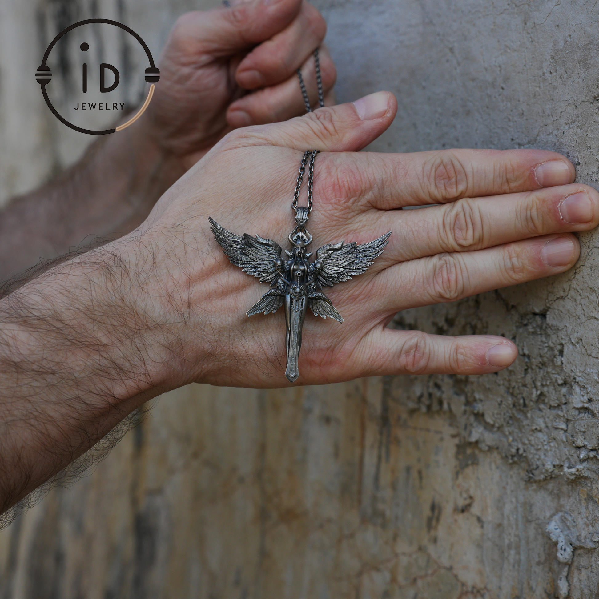 Gothic Warrior Woman Pendant with Wings and Sword in 925 Oxidized Silver Fantasy Totem Necklace for Cosplay Gift for Her Him