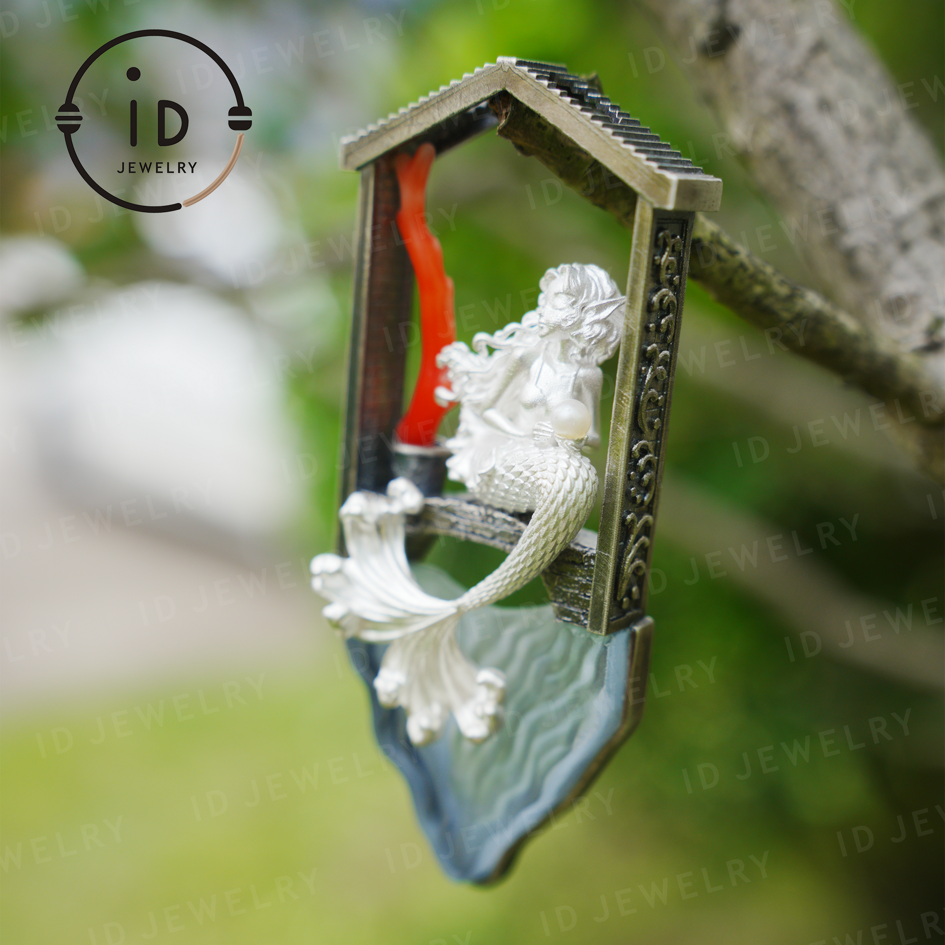 The pavilion and mermaid are delicately sculpted from 925 silver with graceful lines;