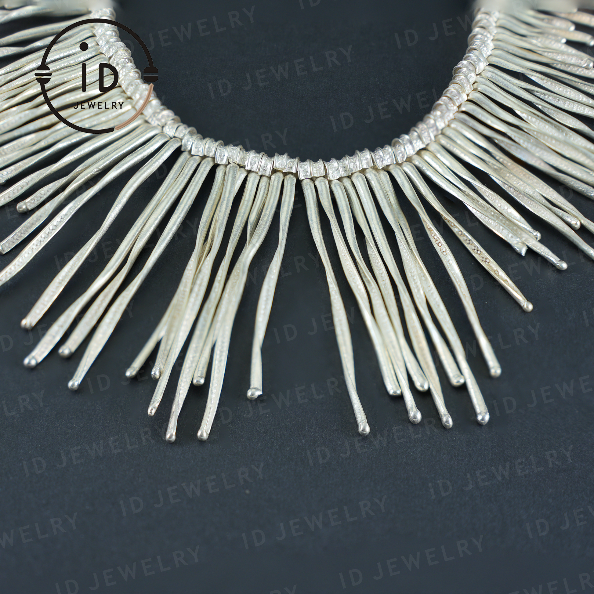 This handmade fringe necklace embodies a beautiful blend of tribal, boho, and vintage aesthetics. Inspired by nature’s organic flow, its long silver strands resemble elements like tree bark or flames, making it a true statement piece.