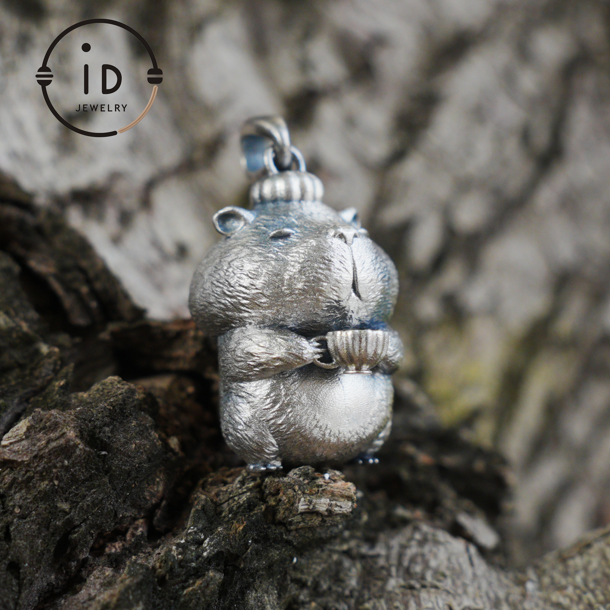 Its round, soft form symbolizes protection and warmth, while the tiny cup in its paws represents patience, mindfulness, and gentle reflection. The oxidized silver surface adds a timeless, calming presence to the piece.