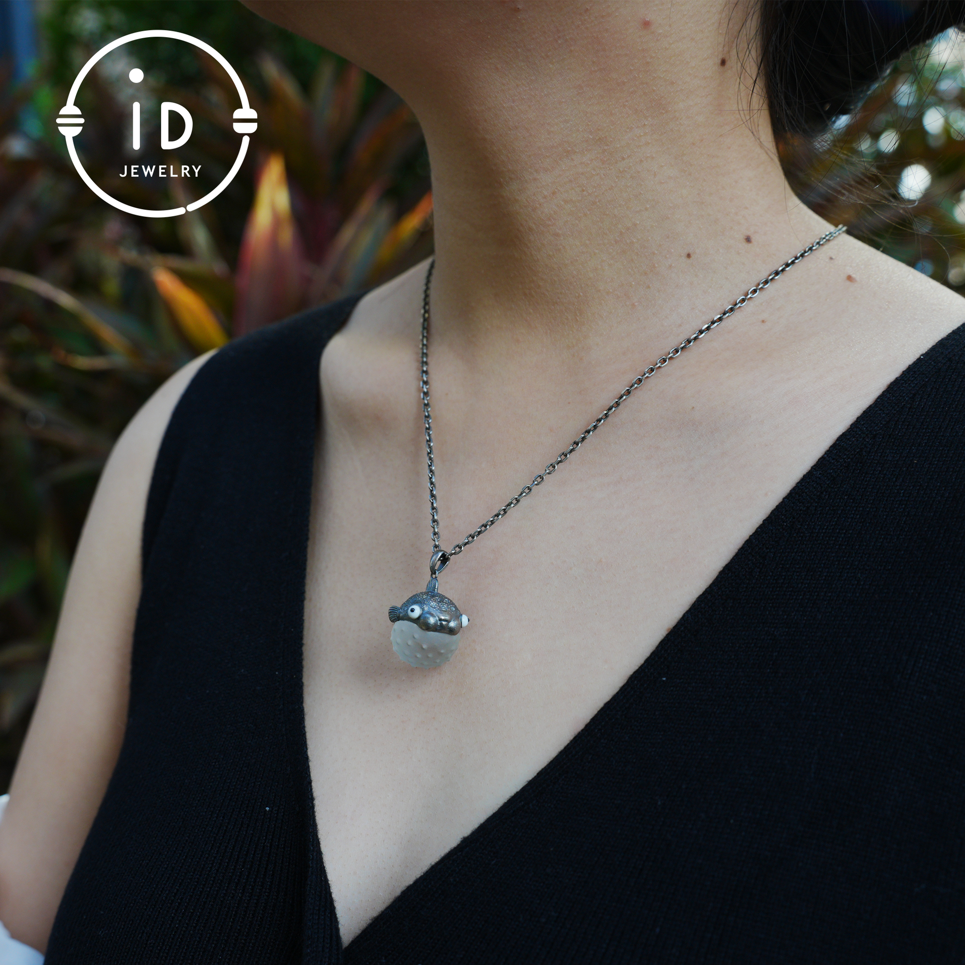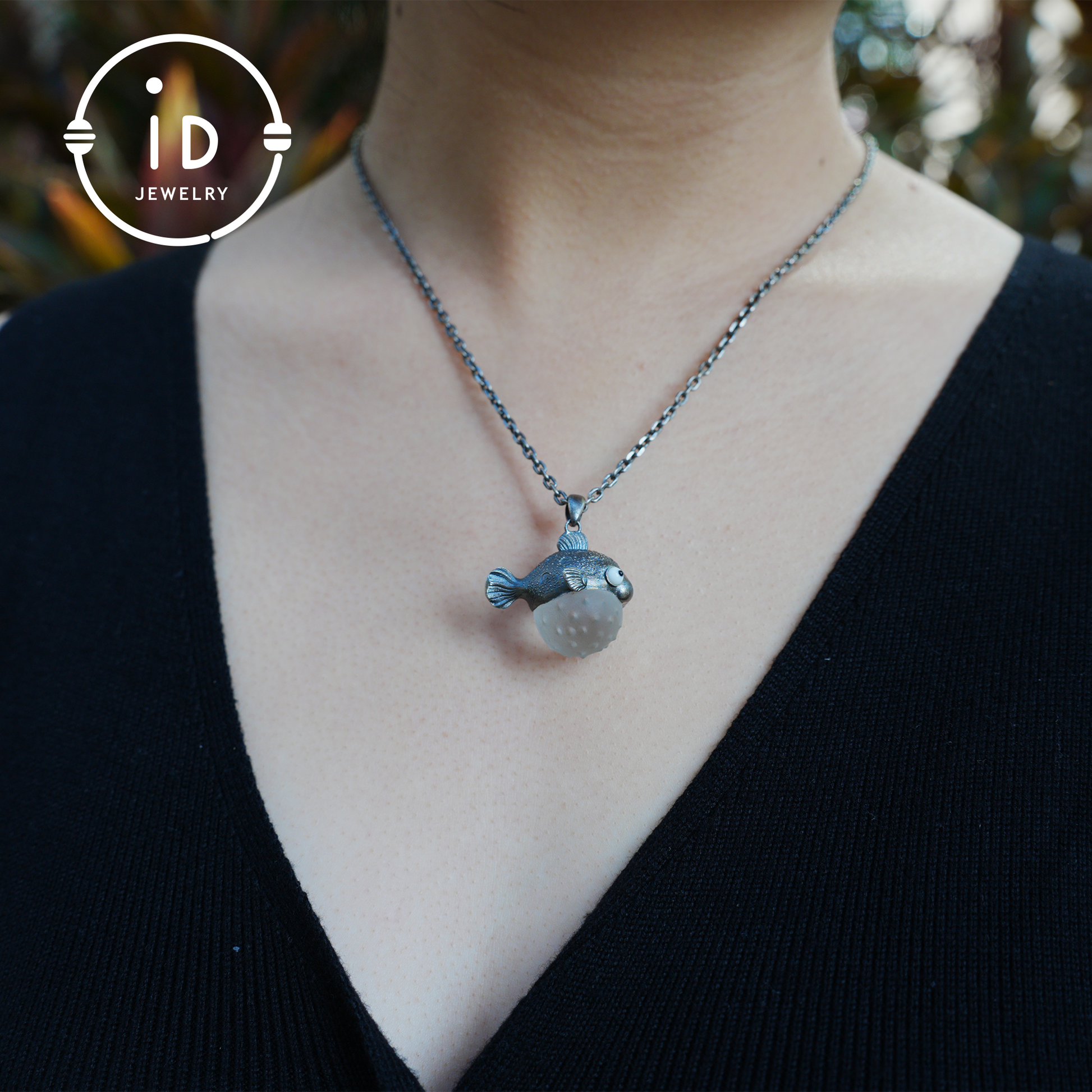 Pufferfish Pendant in White Crystal and 925 Silver, Oxidized, Animal Figurine Jewelry in Fairytale Style, Gift for Her or Decor