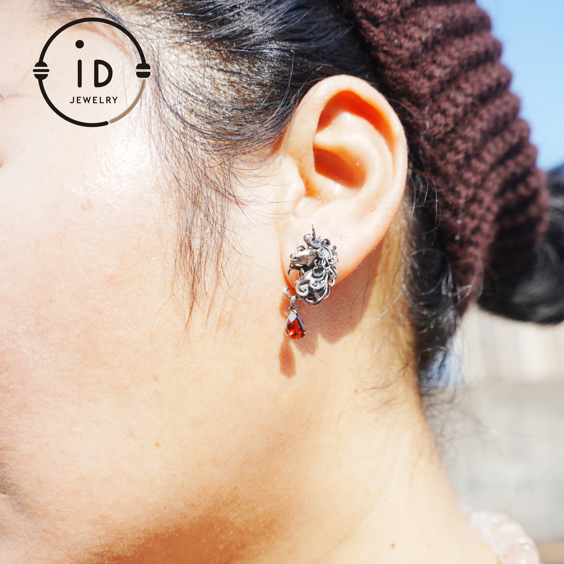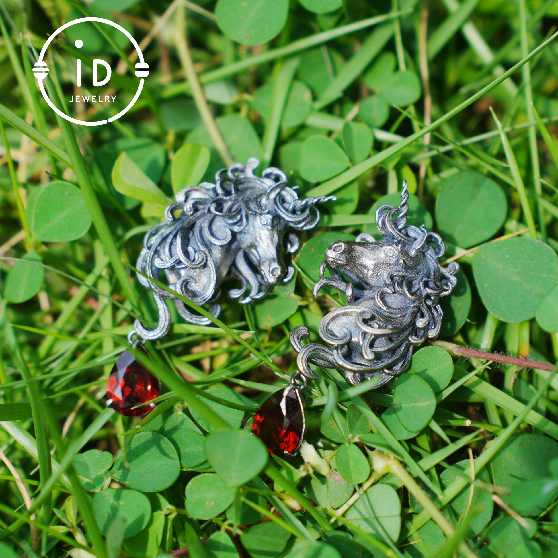 Unicorn Earrings with Garnet Drop, Fantasy Gothic Jewelry, Handcrafted Mythical Creatures, Symbolic Gift for Vow and Protection