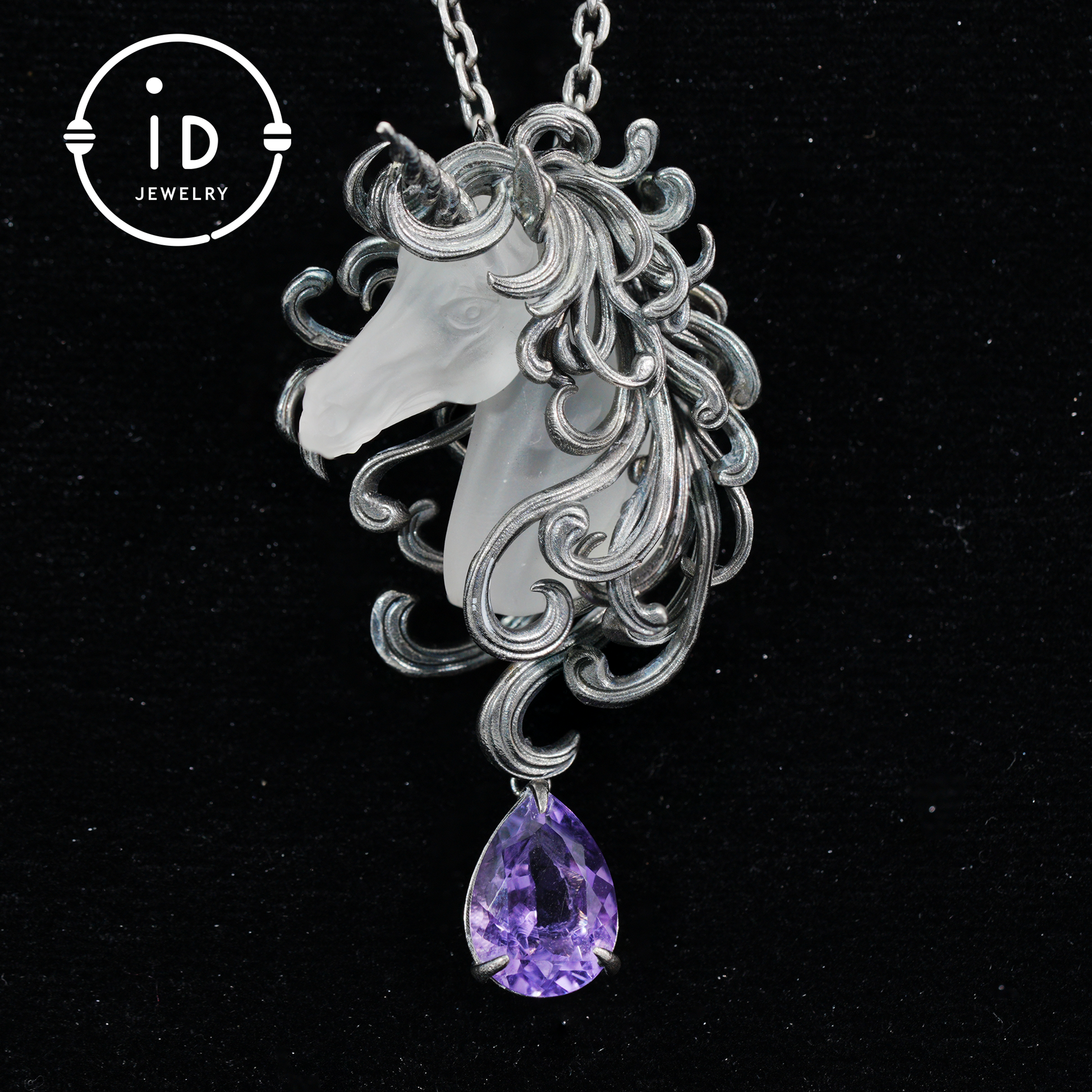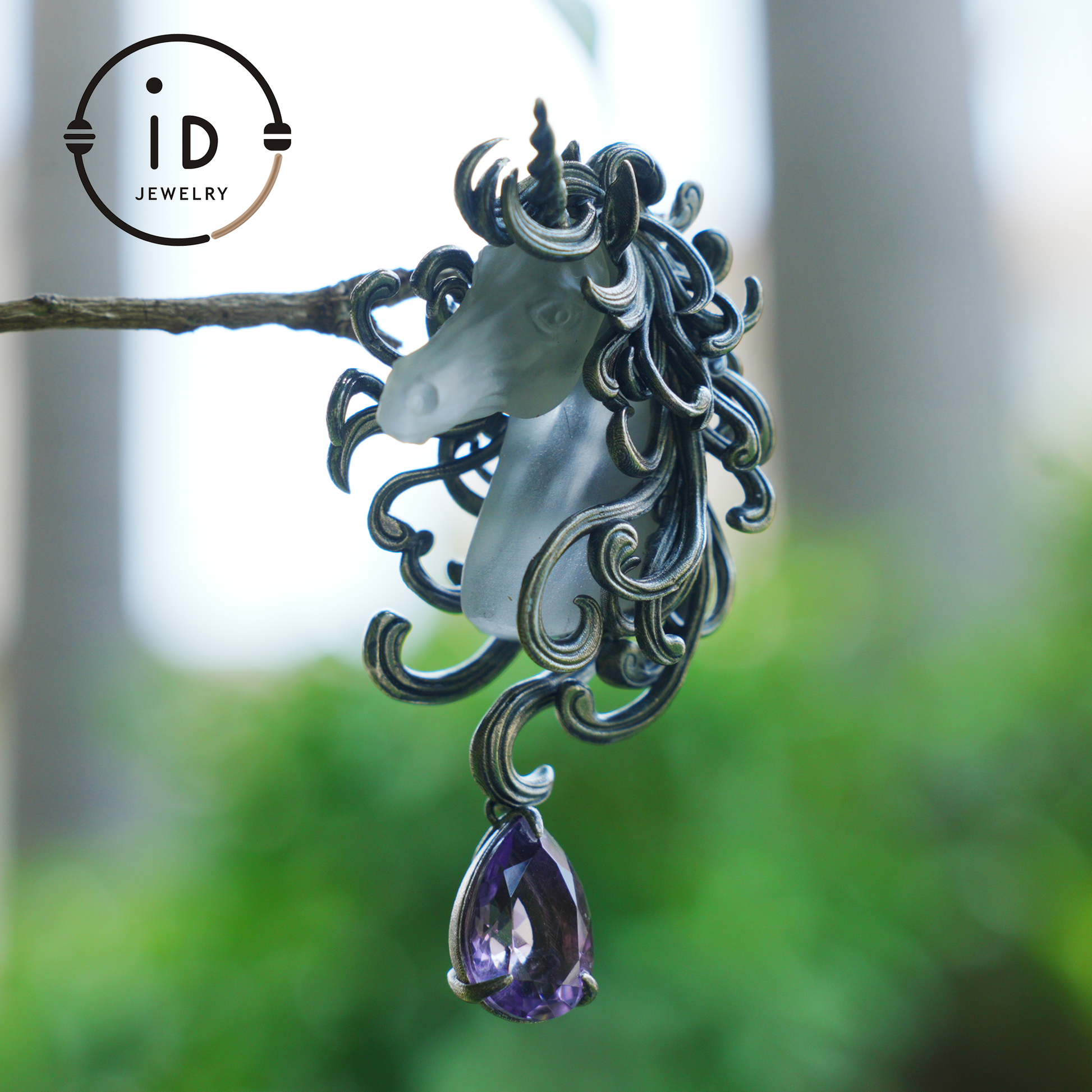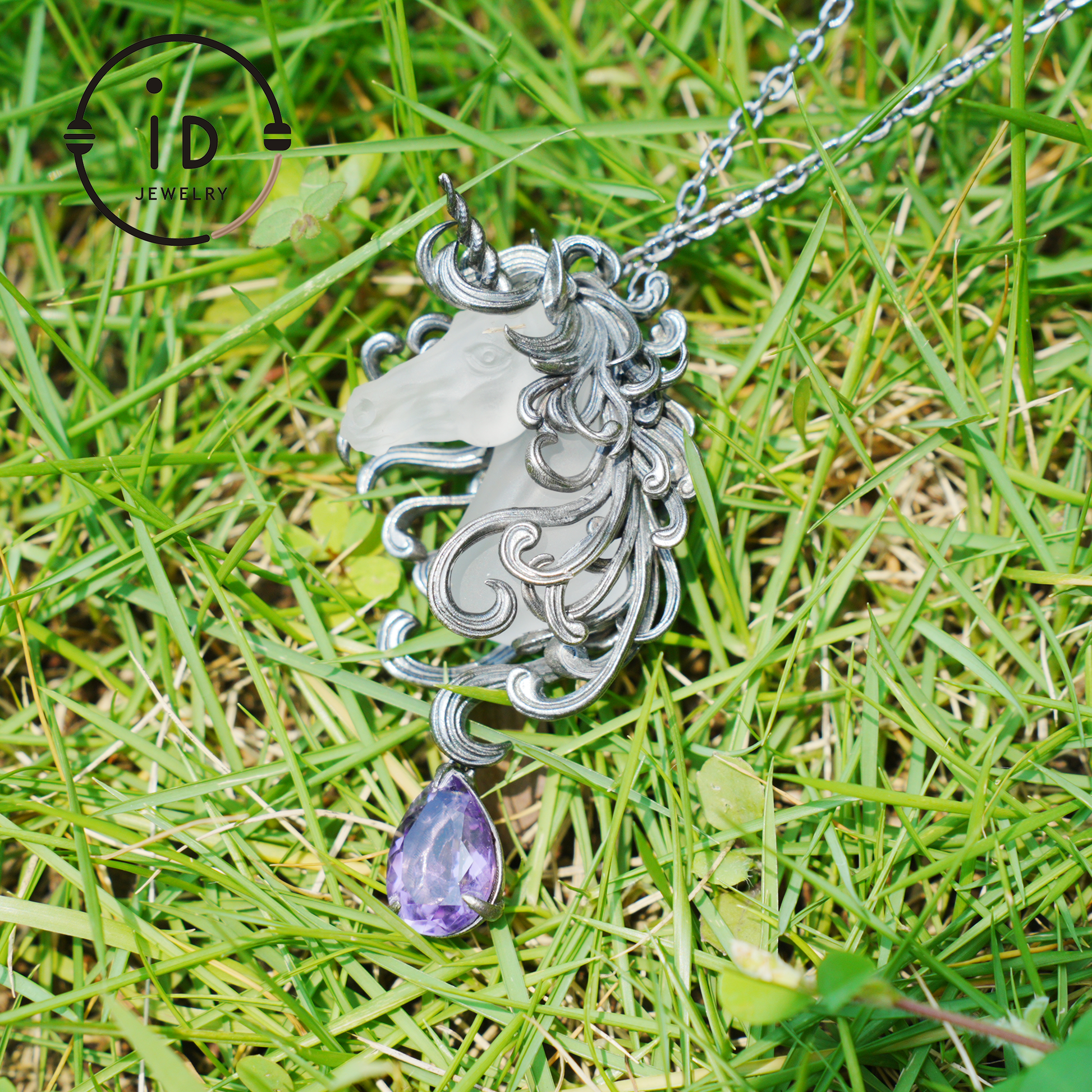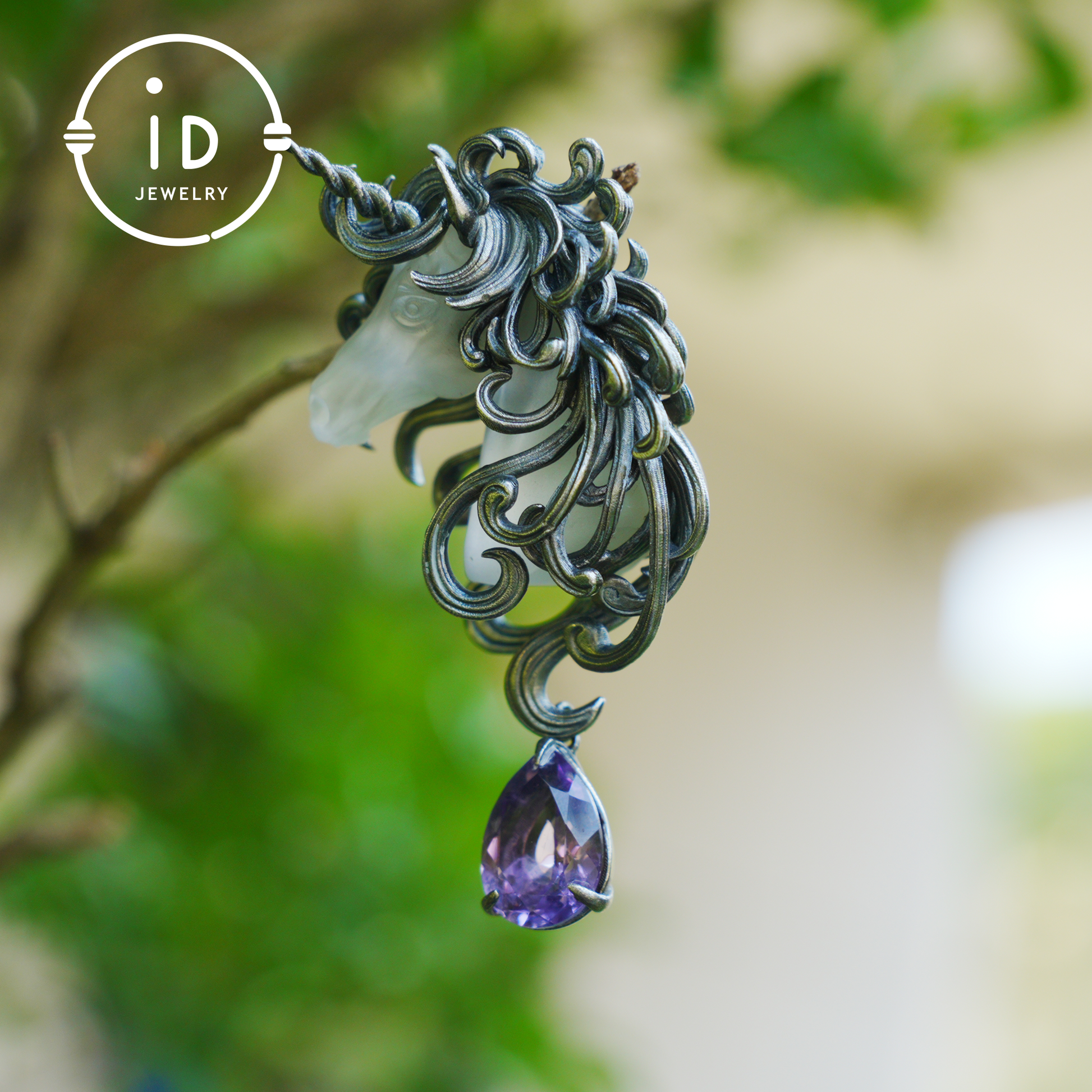 Night falls like water — an unicorn slowly emerges from moonlight. Its forehead horn glitters like unmelted morning frost, the mane sculpted by sea wind into flowing ripples; a purple “moon tear” hangs at the chest and gently swings with each step. It does not dazzle with force but protects with tenderness — reminding the wearer to stay clear and brave in the noise: trust your intuition and believe light will come when needed. ✨🌙
