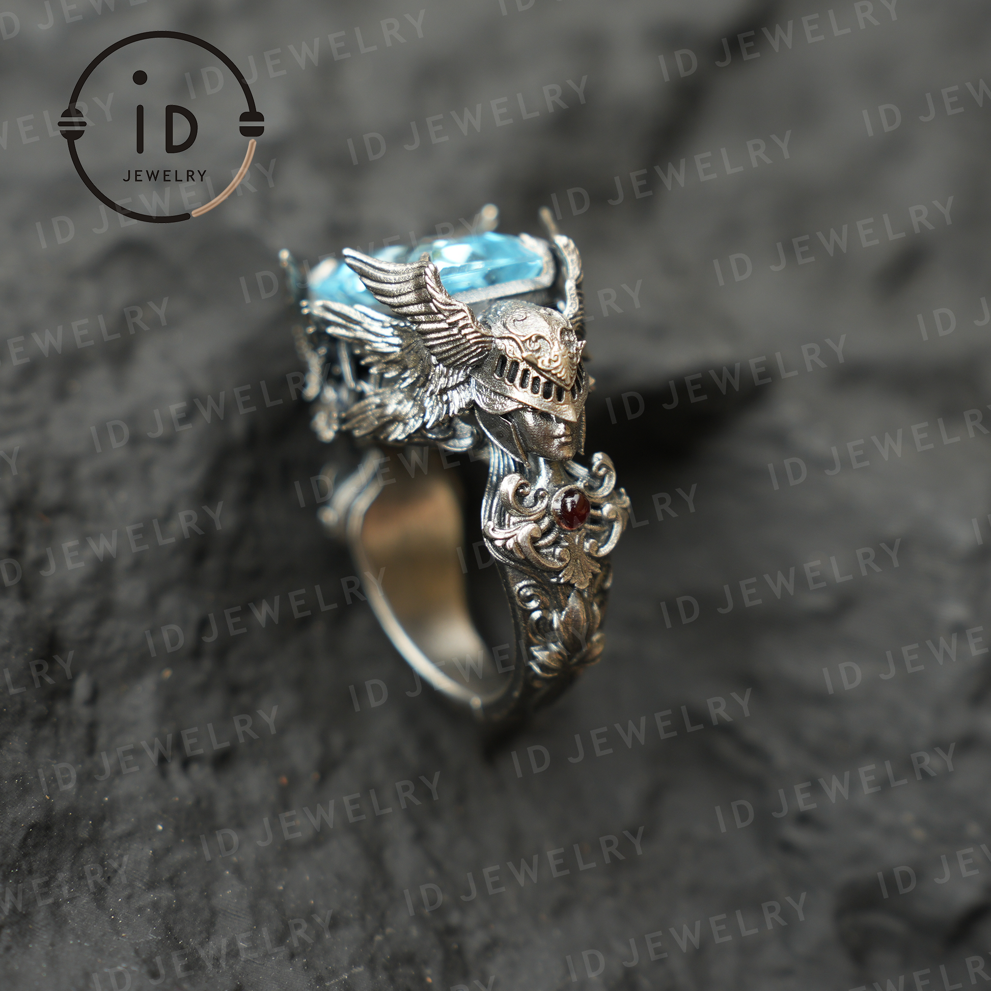 Valkyrie Ring | Blue Topa Stone winged Helmet Design | Nordic Mythical Warrior Goddess Style Handmade Ring