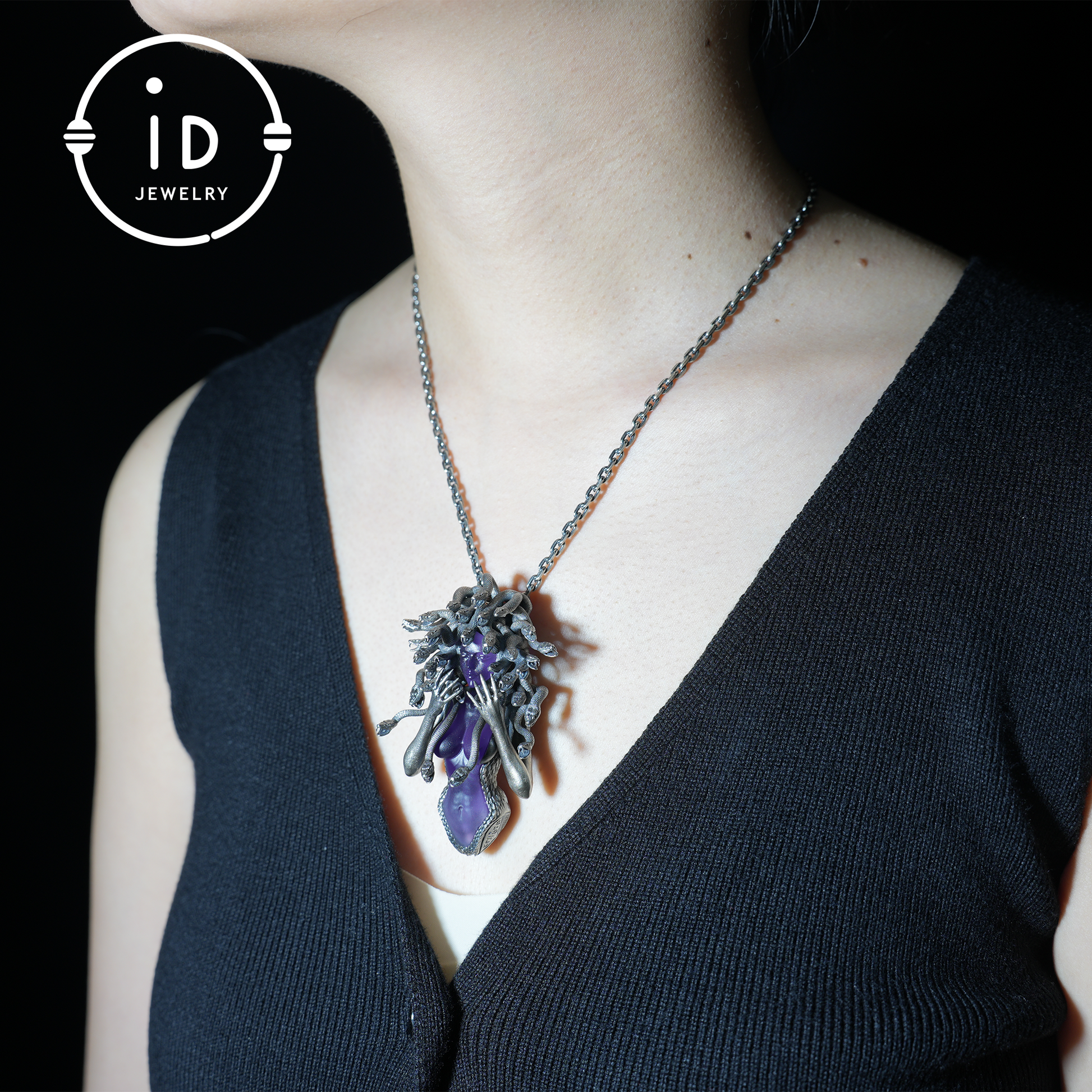 Erwecke deine mystische Seite mit diesem einzigartigen Amethyst-Anhänger im Gothic-Stil. Handgeschnitzt aus hochwertigem violettem Amethyst und eingefasst in oxidiertes 925er Silber, kombiniert dieses Schmuckstück künstlerische Handwerkskunst mit tiefer Symbolik.