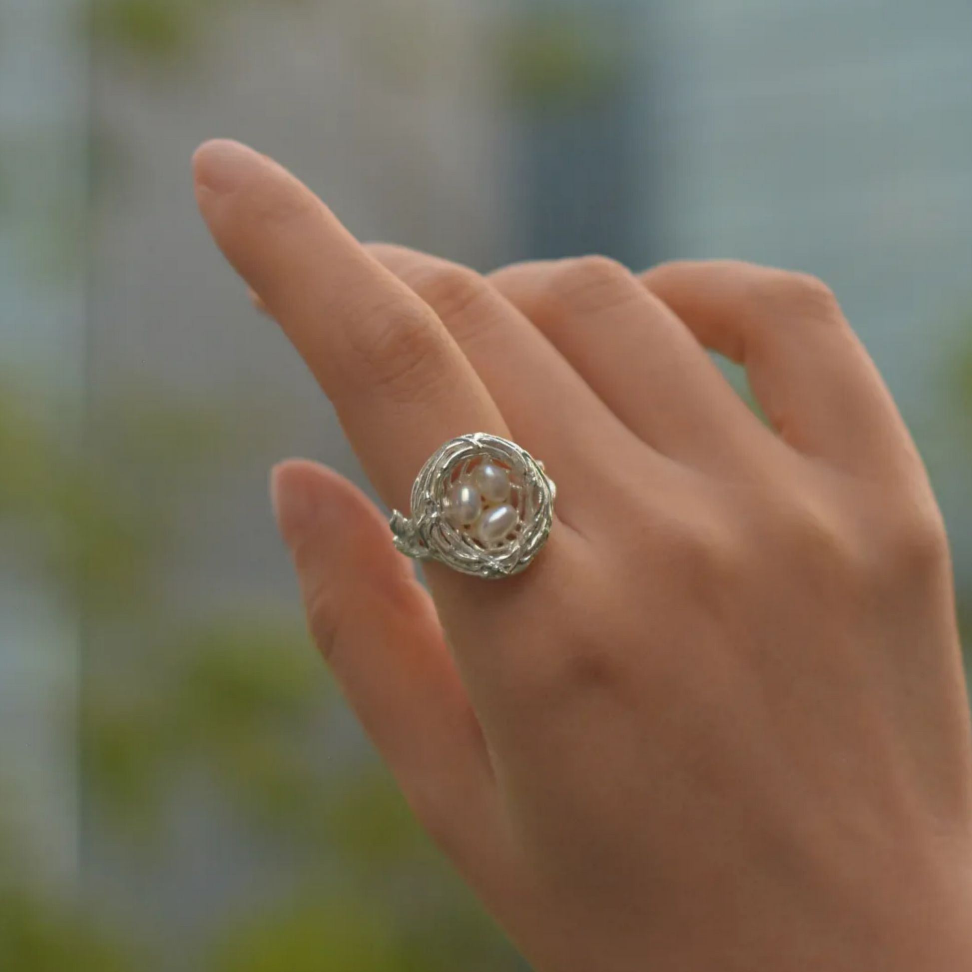 925 Silver Bird Nest Ring | Pearl Nature Jewelry | Handmade Branch Design | Symbol of Home & Love | Gift for Mother or Partner
