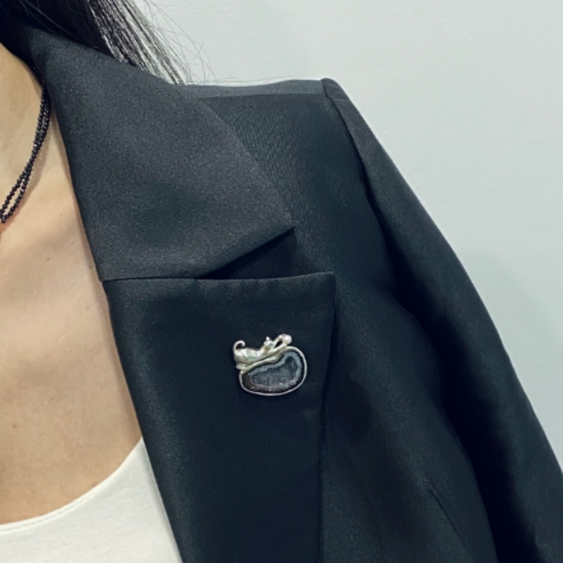 This handcrafted cat totem brooch pendant features a playful silver cat reaching for a natural freshwater pearl above a raw geode crystal base. With sapphire eyes glimmering with curiosity, this piece symbolizes intuition, awareness, and the beauty of quiet exploration.
