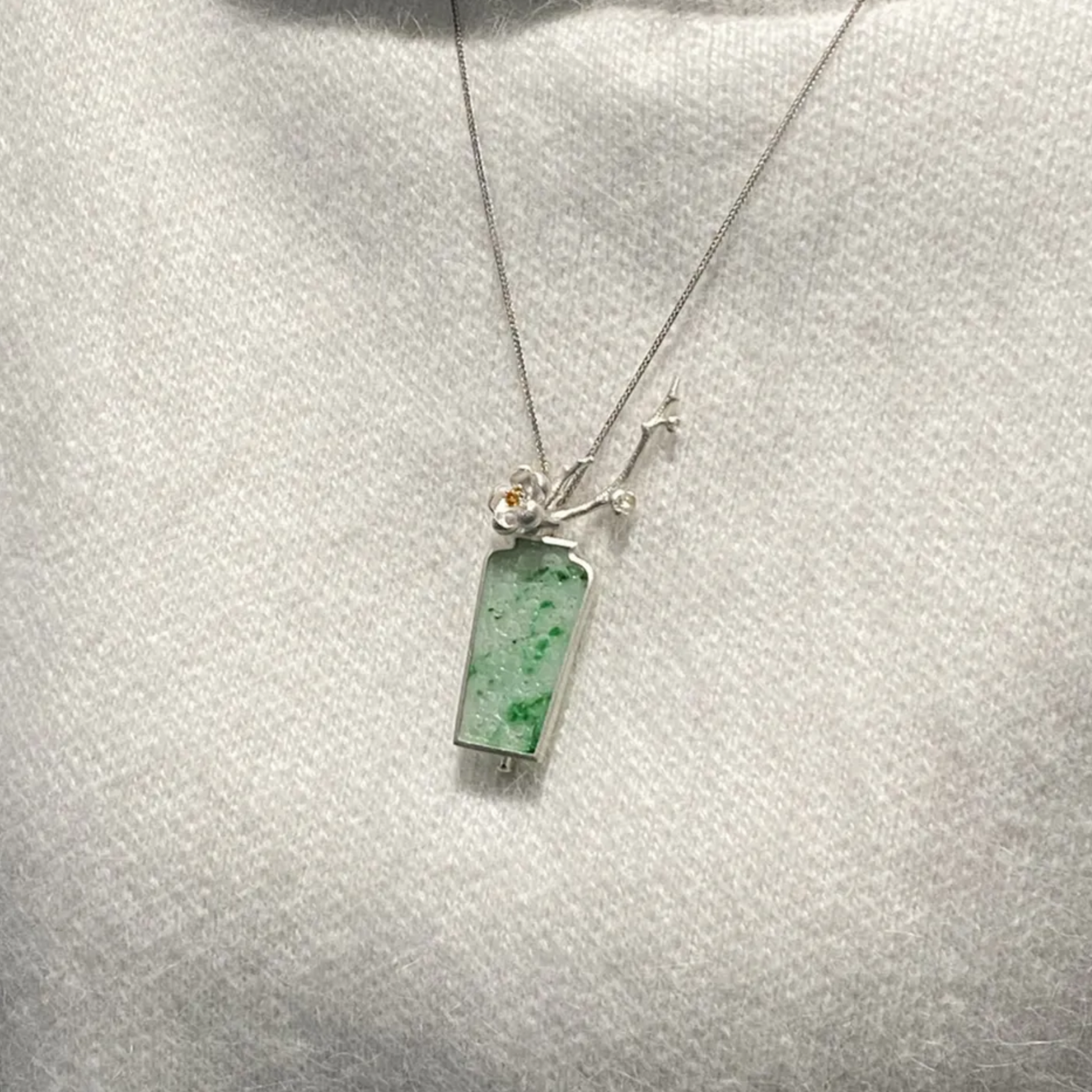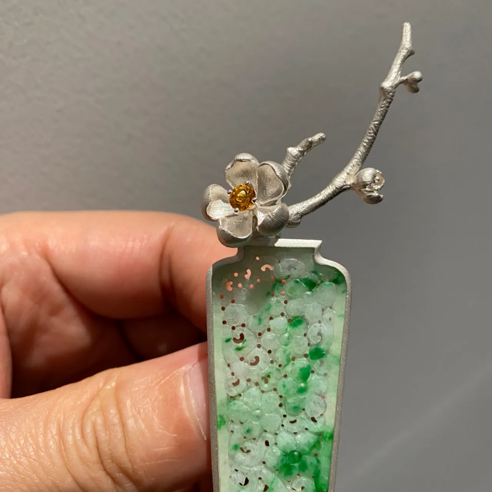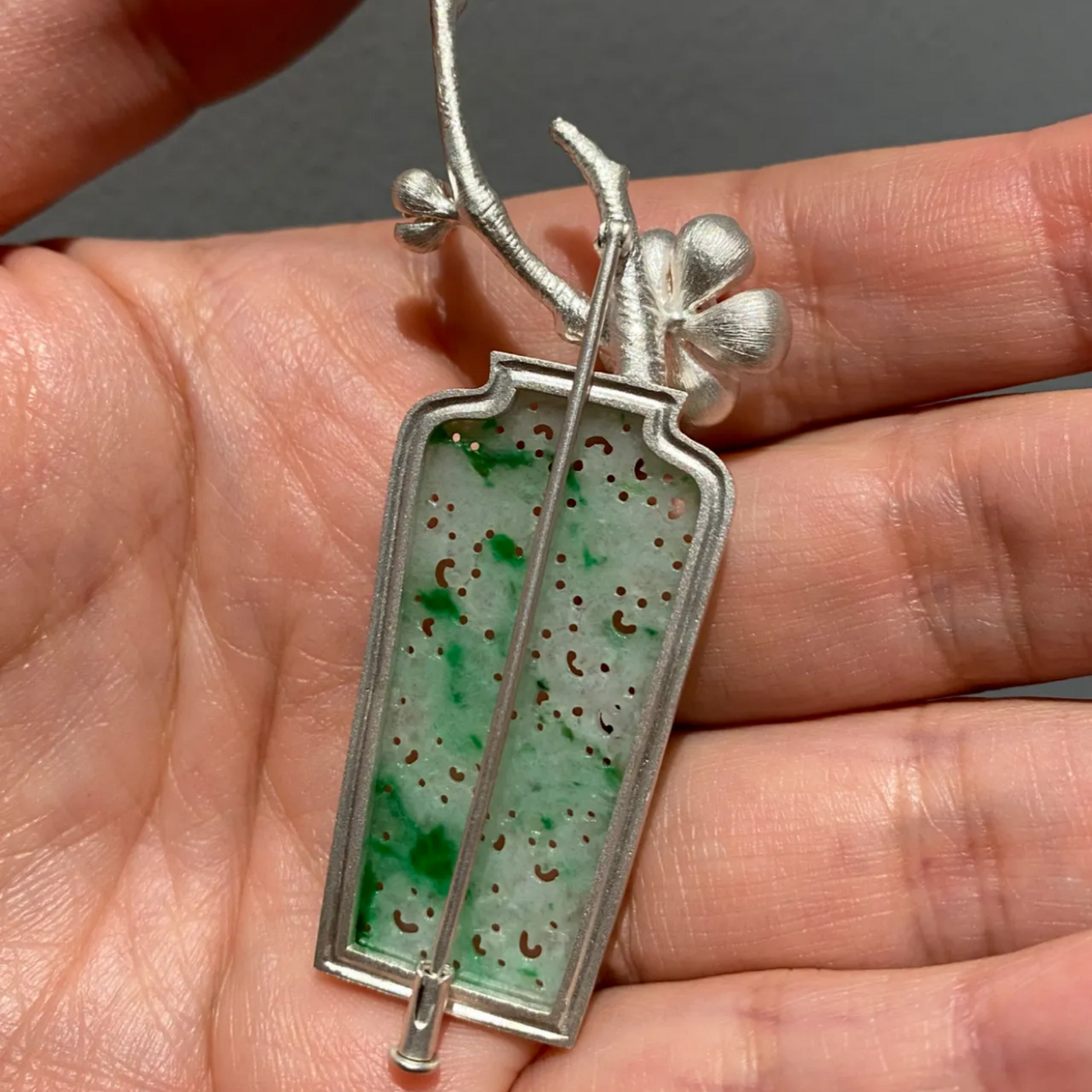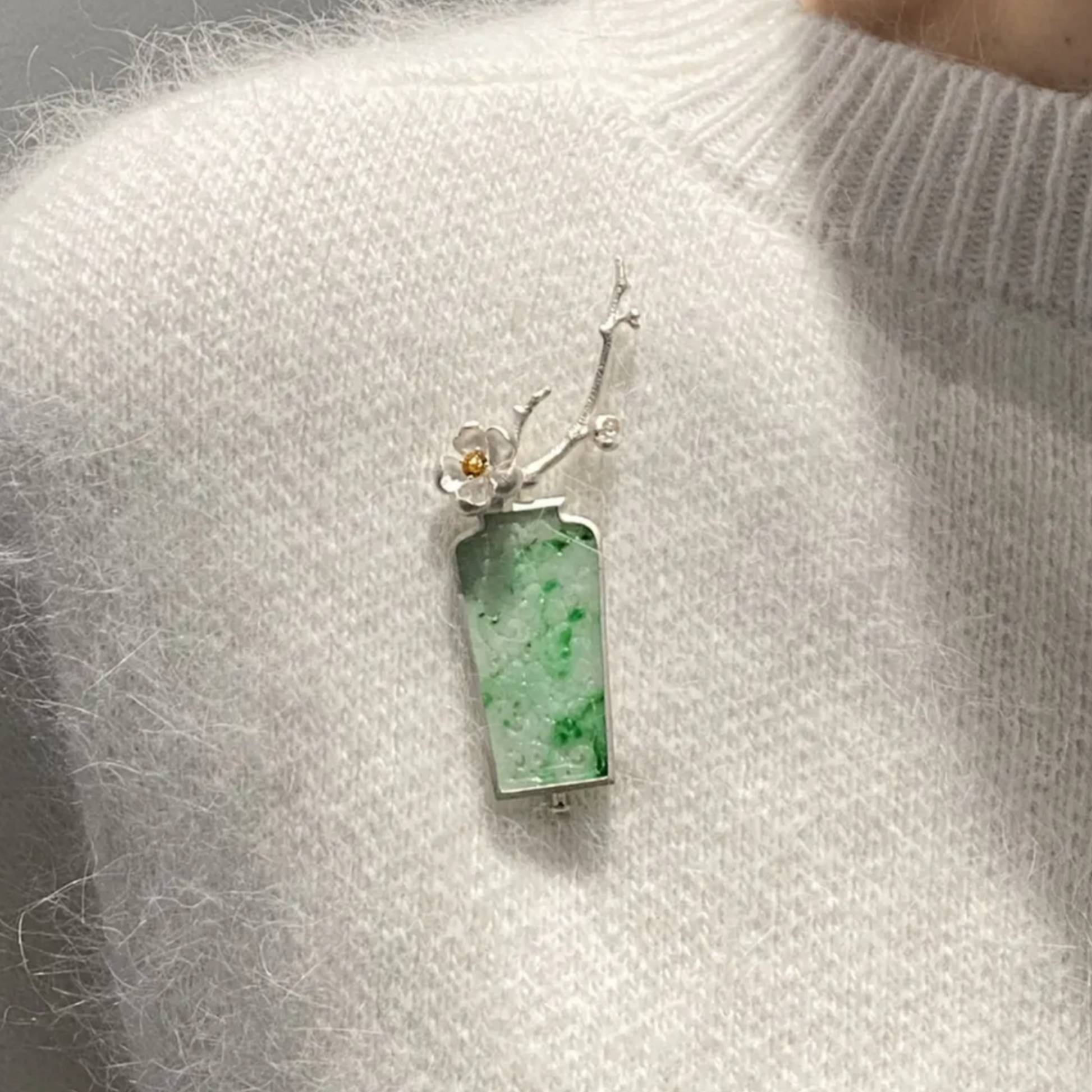 “Jade Vase Blossom” — a handcrafted 2-in-1 brooch and pendant that gracefully unites silver artistry with Eastern symbolism.
