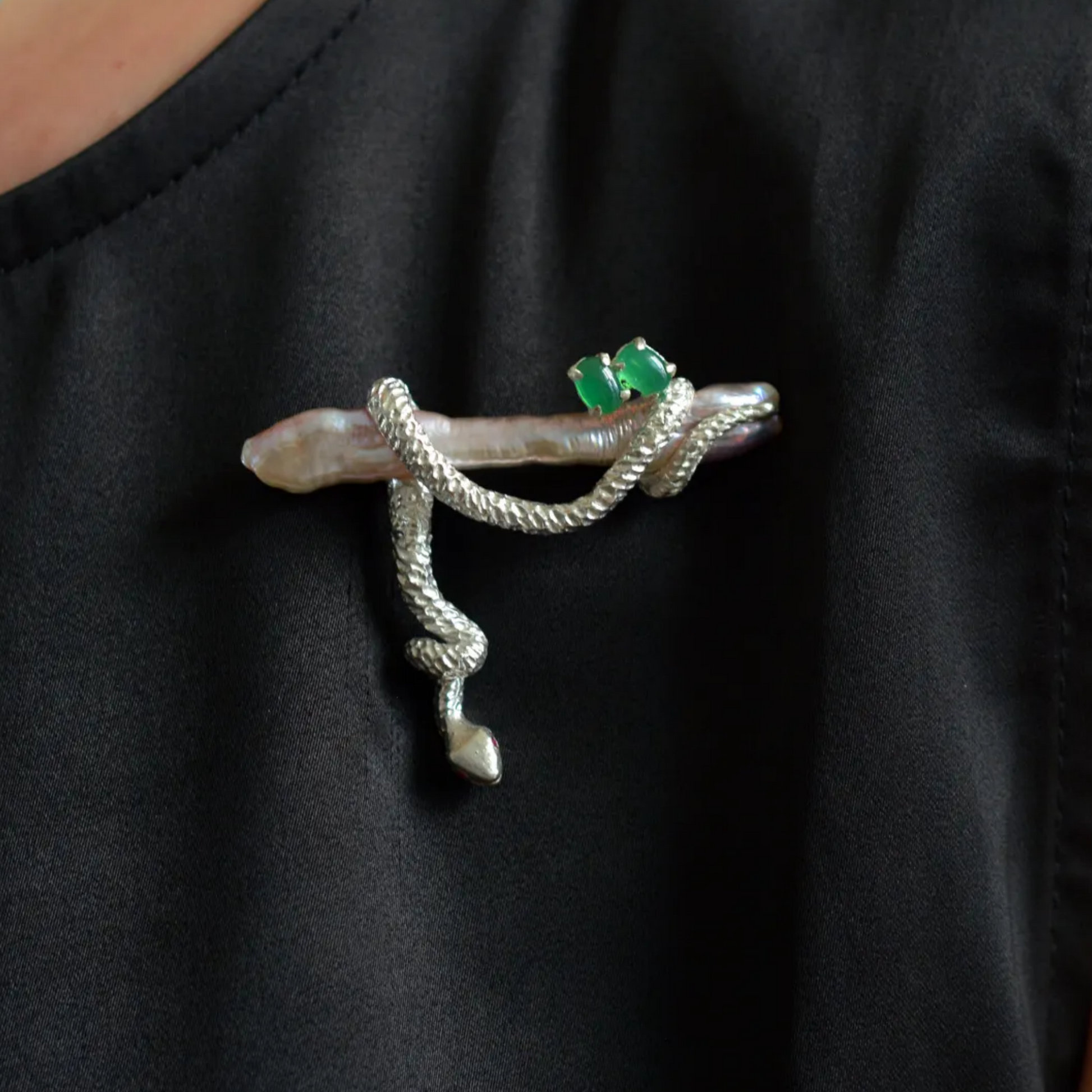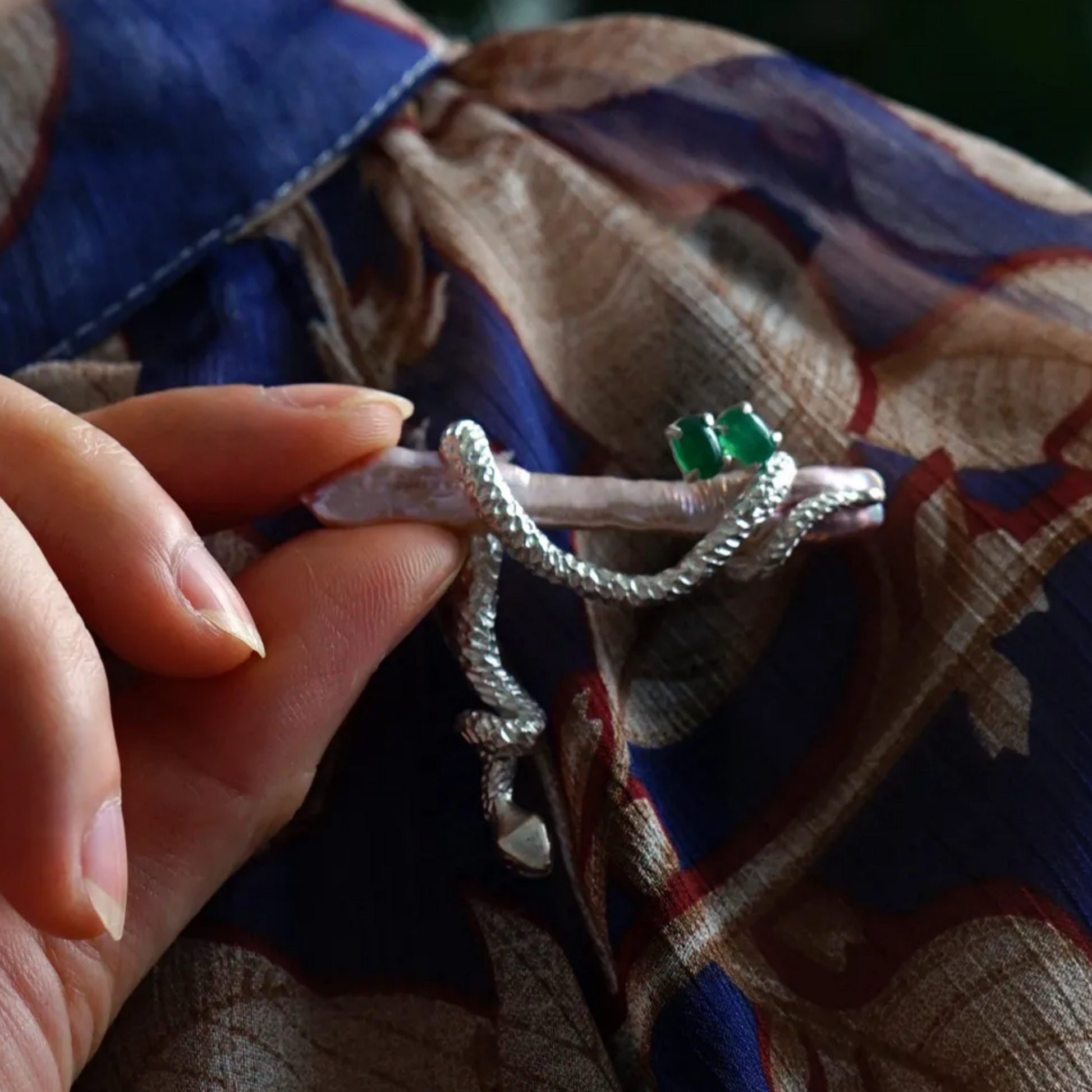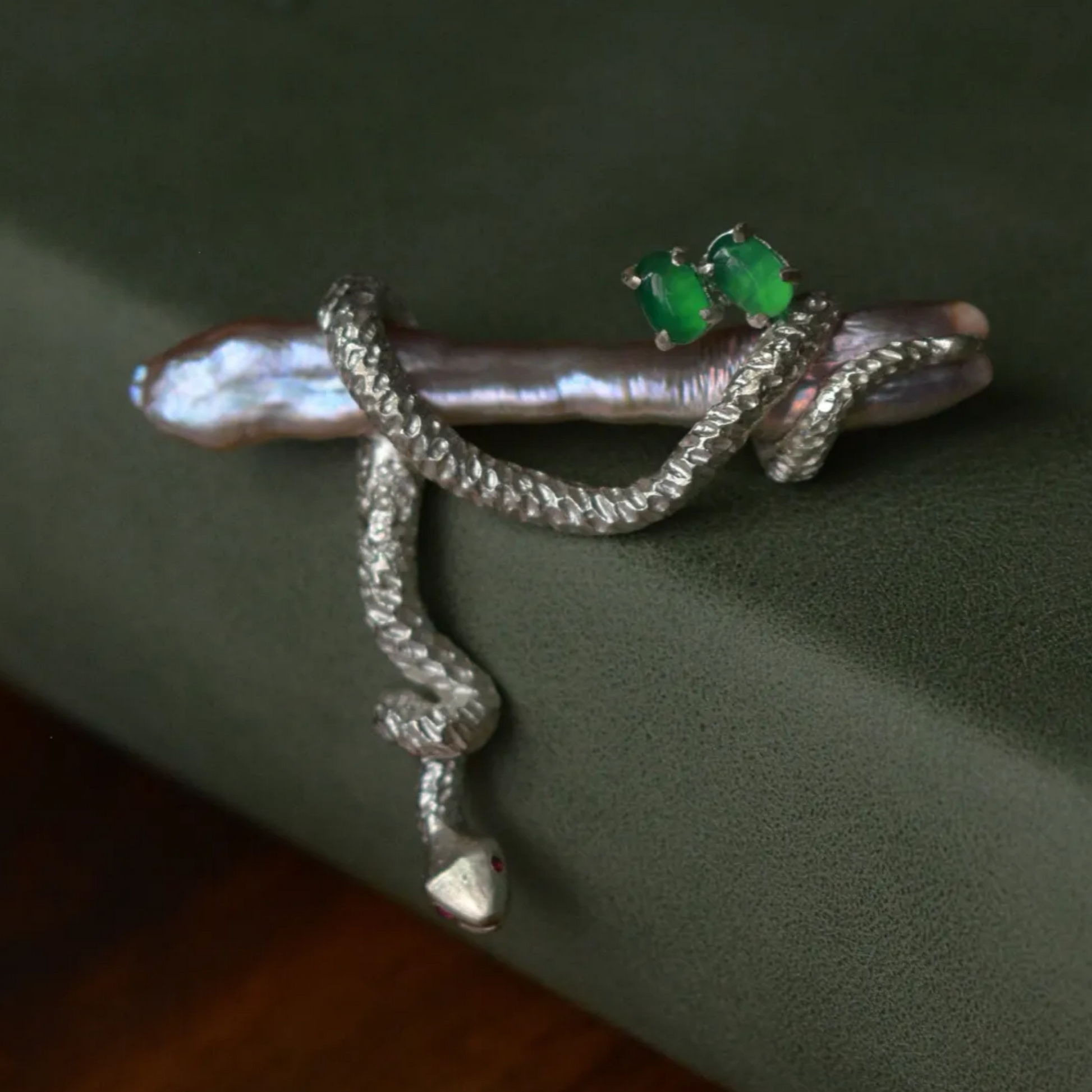 A hand-sculpted silver snake coils elegantly around a natural baroque pearl branch, its ruby eyes glowing with life’s awareness. Two green chrysoprase stones crown the form like “fruits of healing,” symbolizing rejuvenation and emotional awakening.