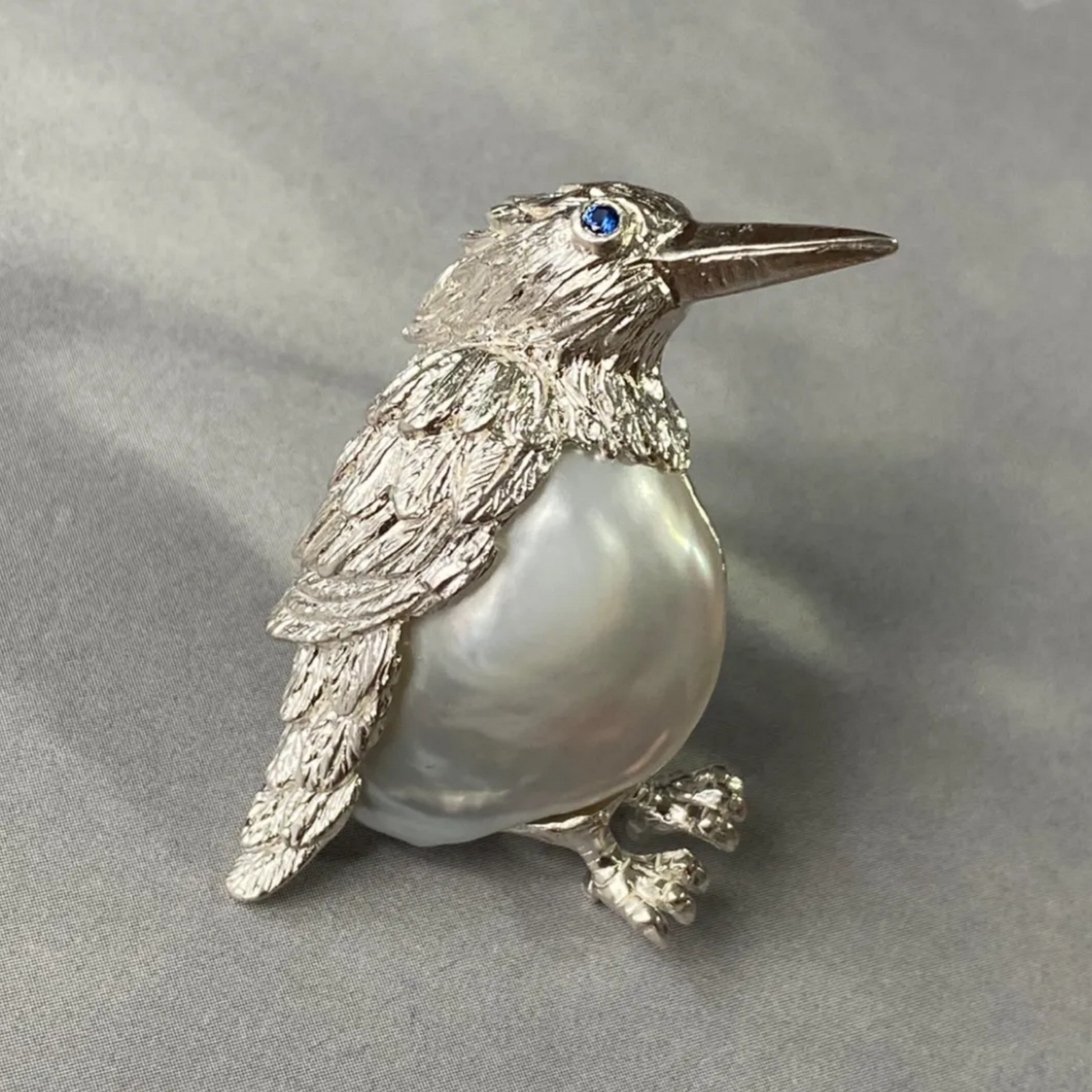 This Bird Brooch Pendant is a dual-wear design handcrafted in 925 sterling silver, featuring a natural freshwater pearl body and a sapphire-set eye.
