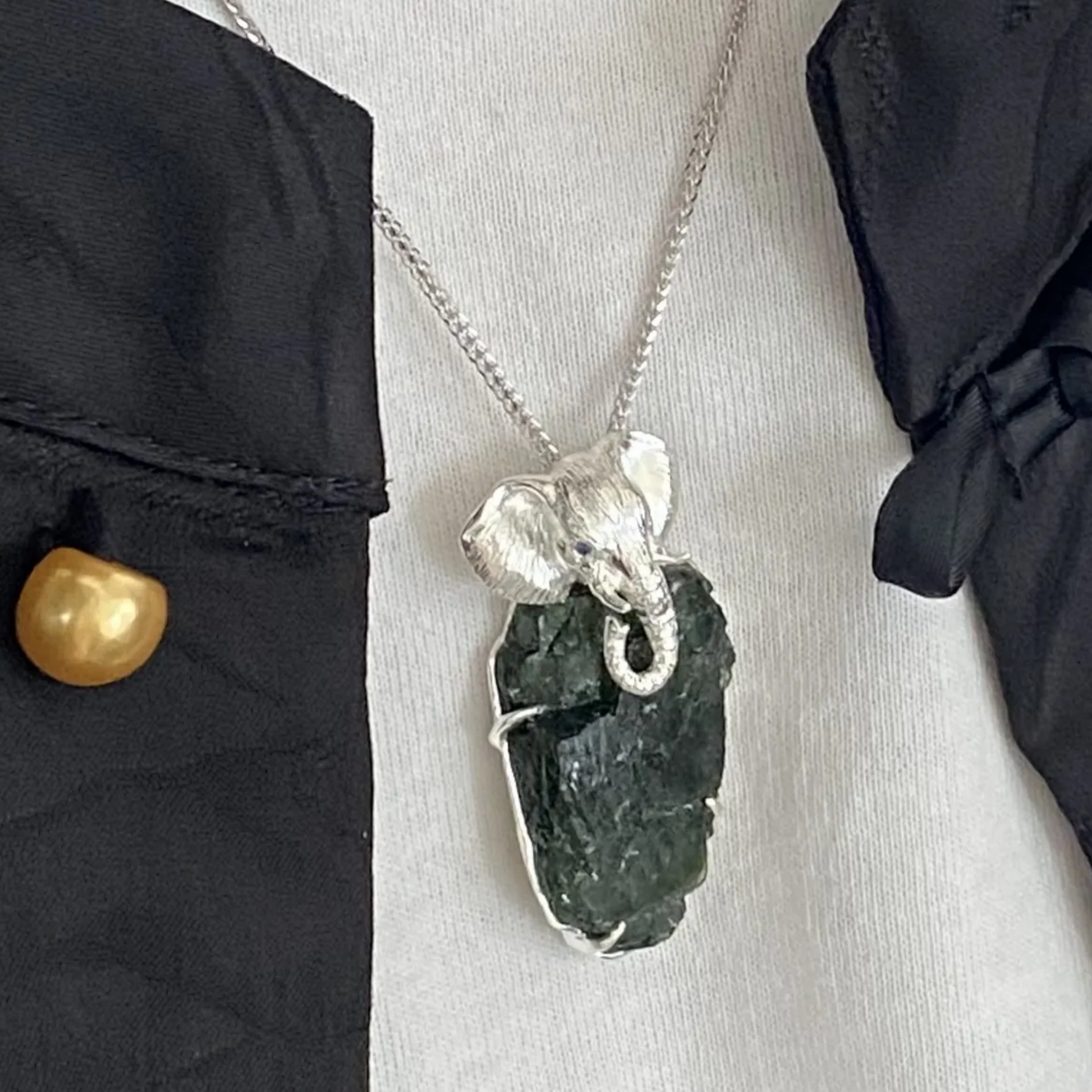 This Elephant Totem Brooch Pendant is meticulously handcrafted from 925 sterling silver and a natural green tourmaline crystal.