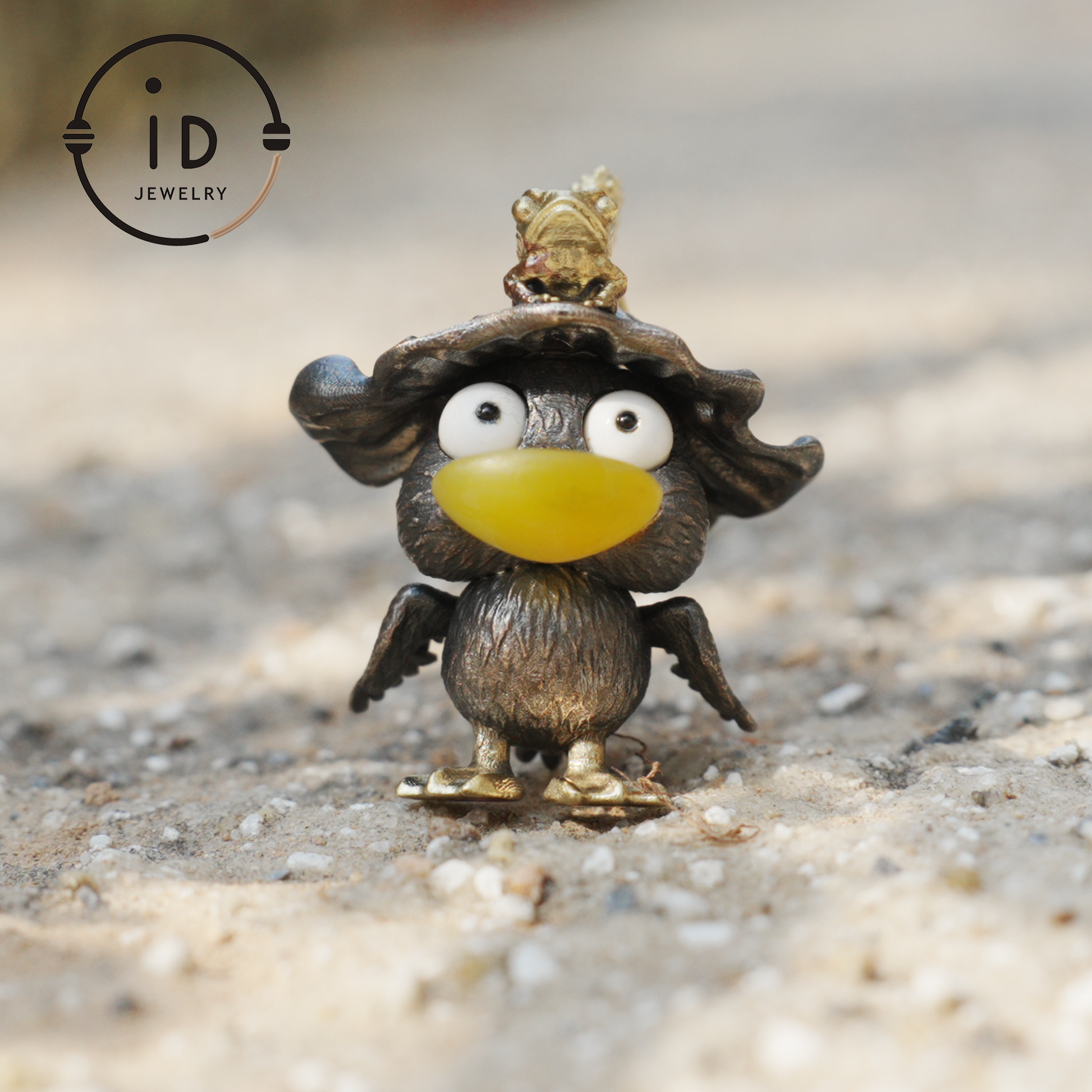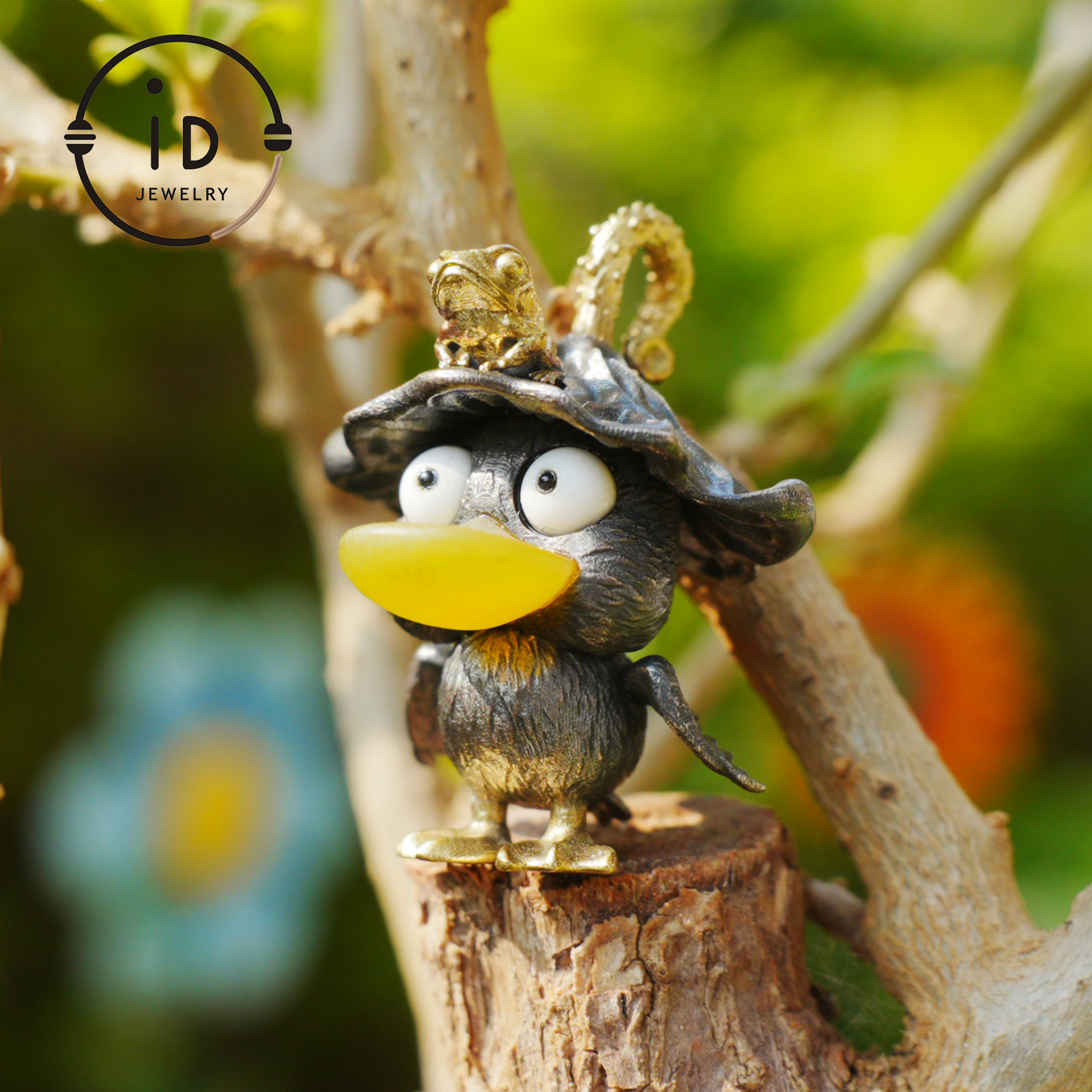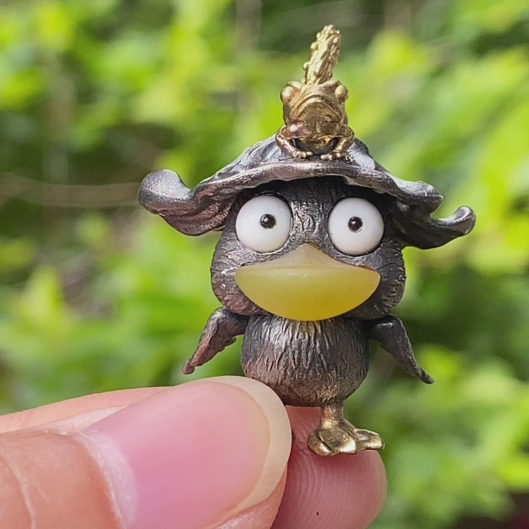 925 sterling silver with oxidized finish, yellow agate (beak), white howlite (eyes), black onyx (body details), bronze accents (hat, frog, feet)