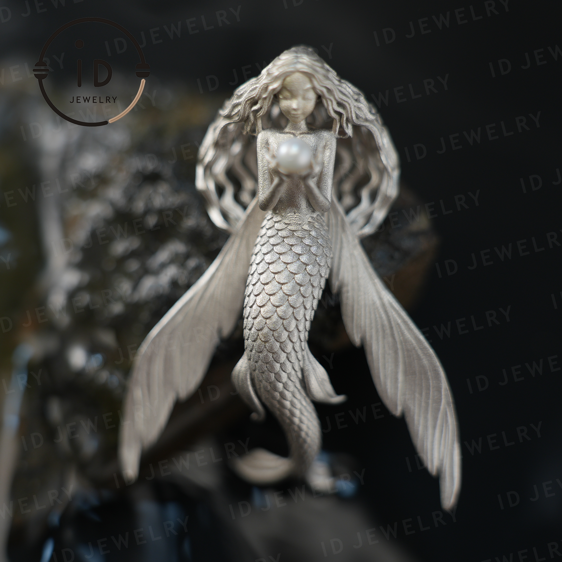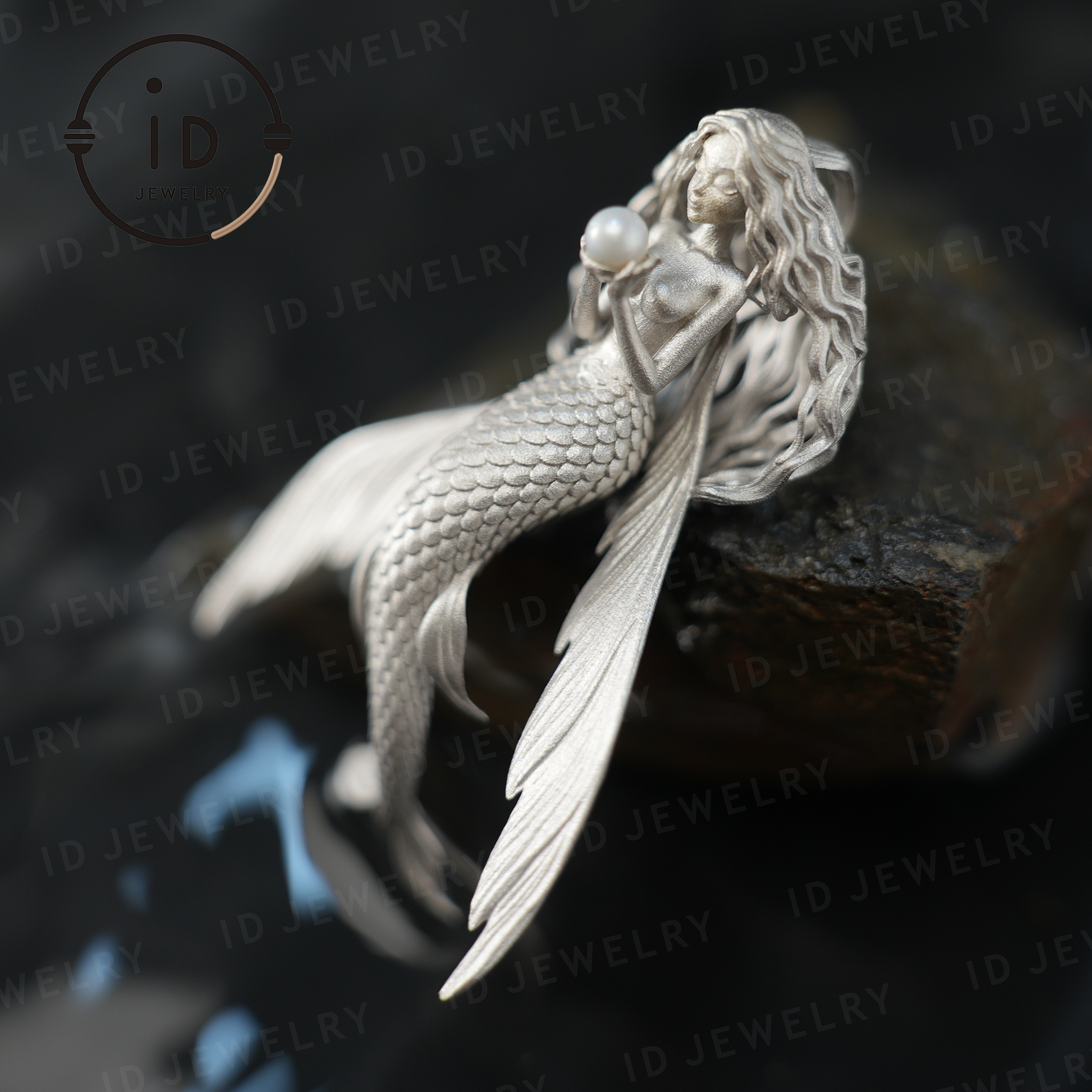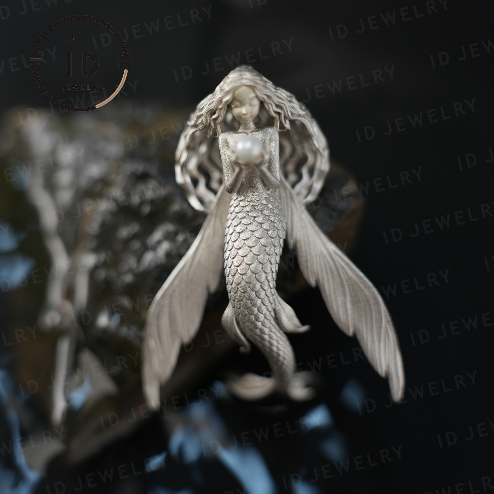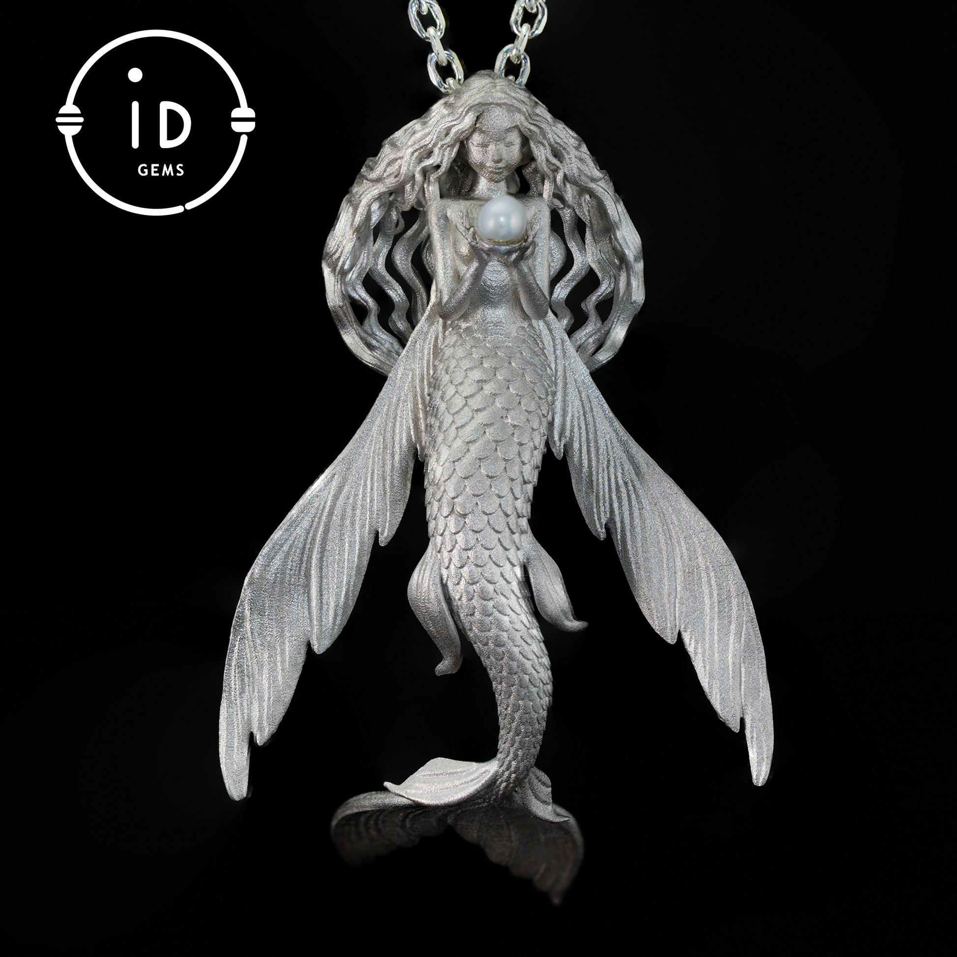 Umarmen Sie den Geist des Meeres mit diesem handgefertigten Anhänger, der ein anmutiges Mädchen in Form eines fliegenden Fisches zeigt, das eine leuchtende Süßwasserperle hält – wie eine Hüterin der Träume.