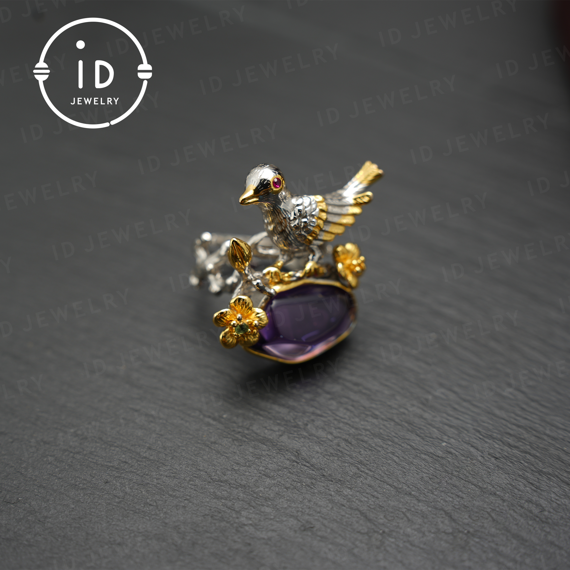 Handgefertigter Amethyst-Vogel- und Blumenring, vergoldetes Design, perfektes Geschenk zur Verlobung oder zum Jahrestag