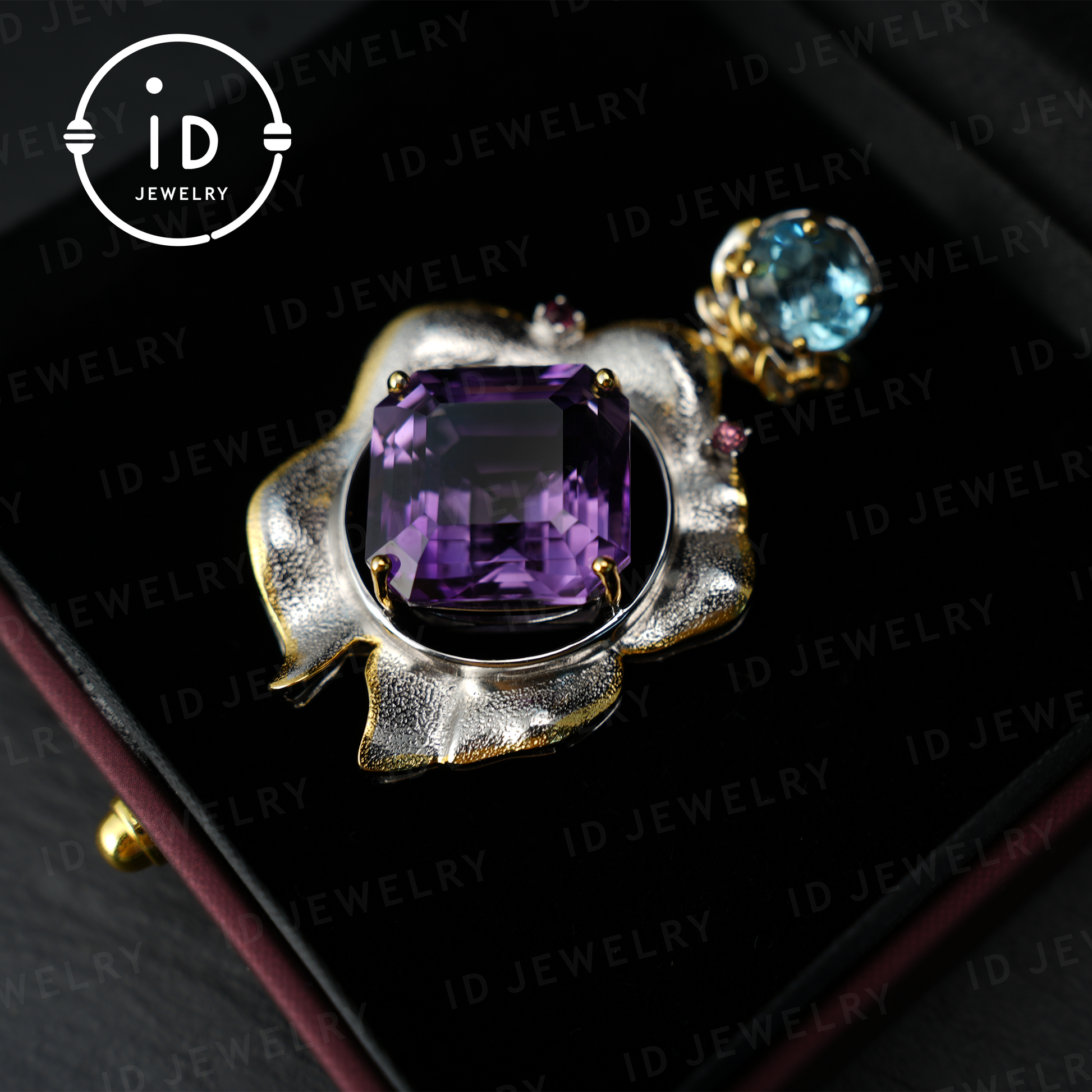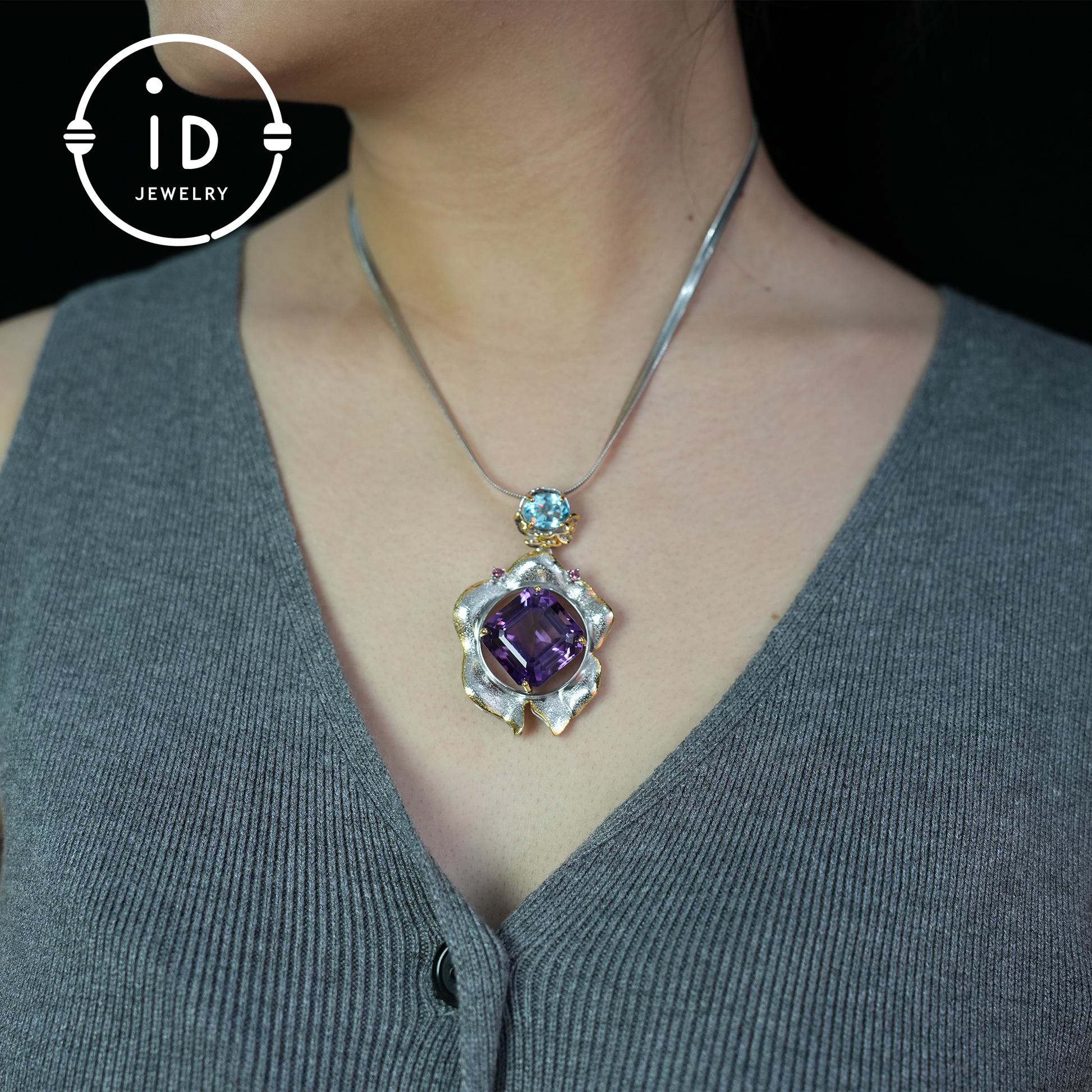 Handgefertigter Amethyst-Blumenanhänger, Vintage-Stil, großer Edelsteinanhänger, einzigartiges Design