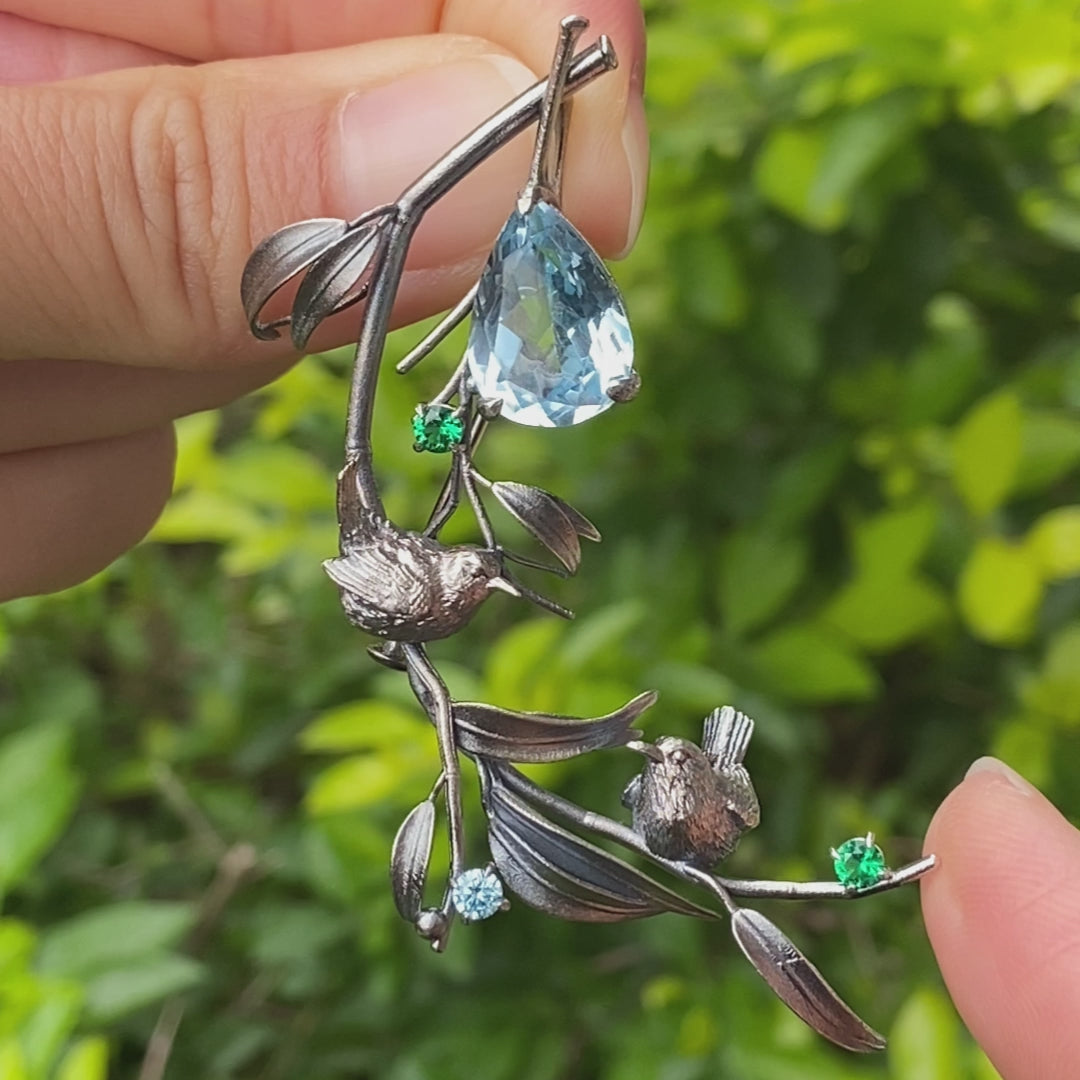 Handmade Brooch & Pendant with Blue Topaz, Green Gemstone, Oxidized 925 Silver, Nature-Inspired Fairy Jewelry, Gift for Her