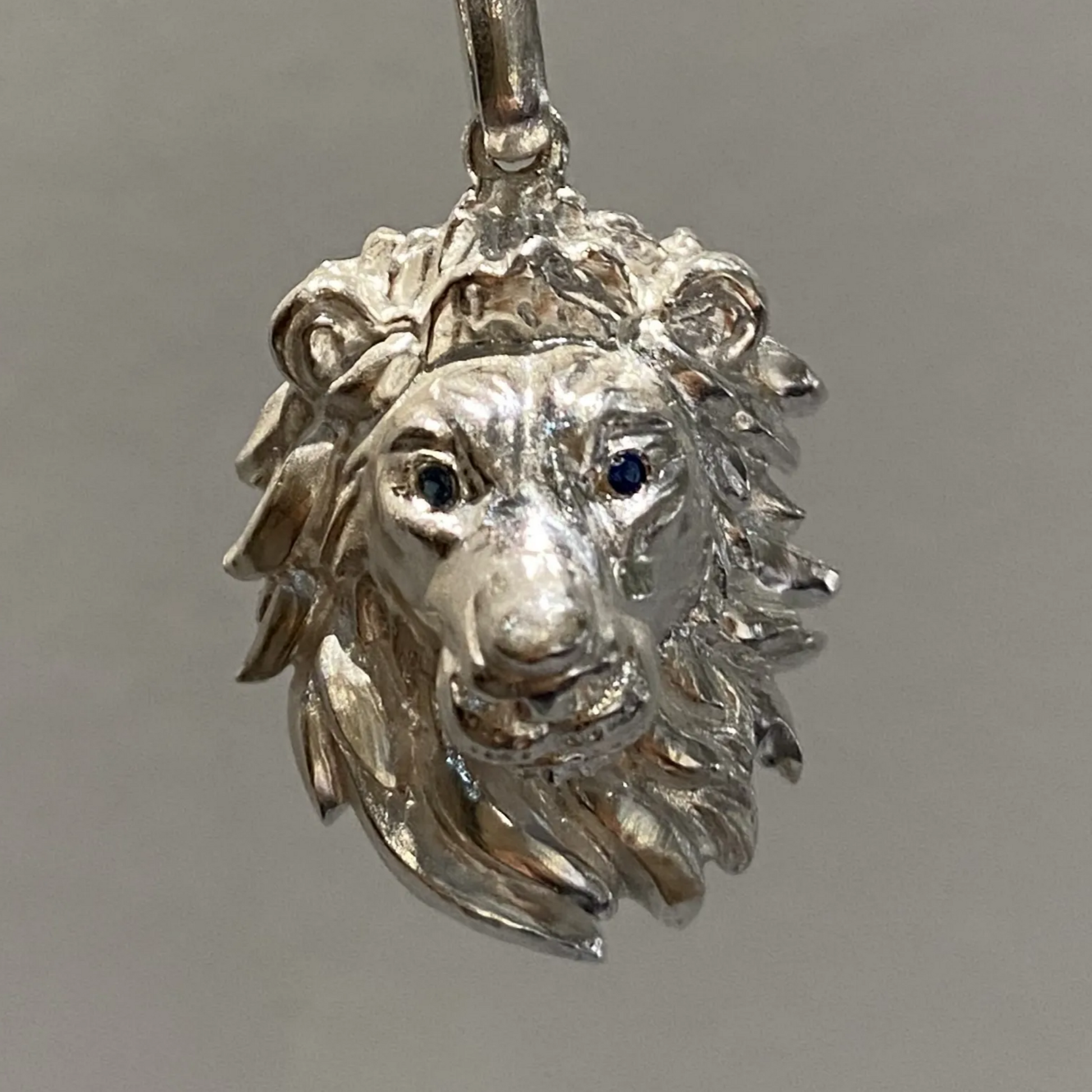 This Lion King Pendant Necklace is handcrafted from 925 sterling silver, featuring a sculpted lion head with natural sapphire eyes.