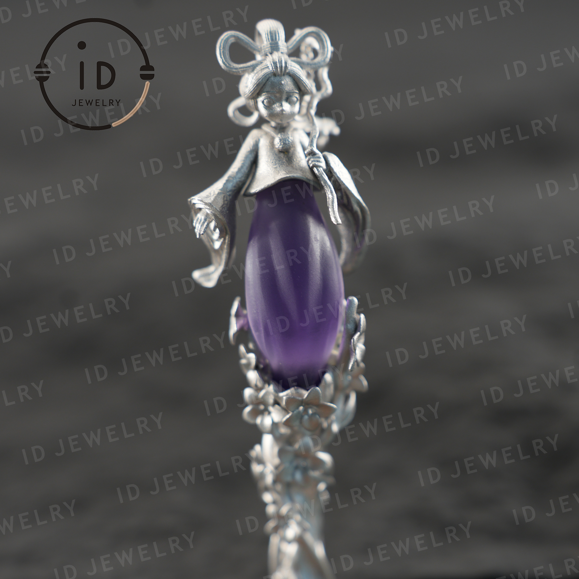 Dieser exquisite Haarstab zeigt eine zarte Feenfigur, florale Ranken und einen geschnitzten Amethystkern. Ein bezauberndes Stück für Fantasy-Liebhaber.