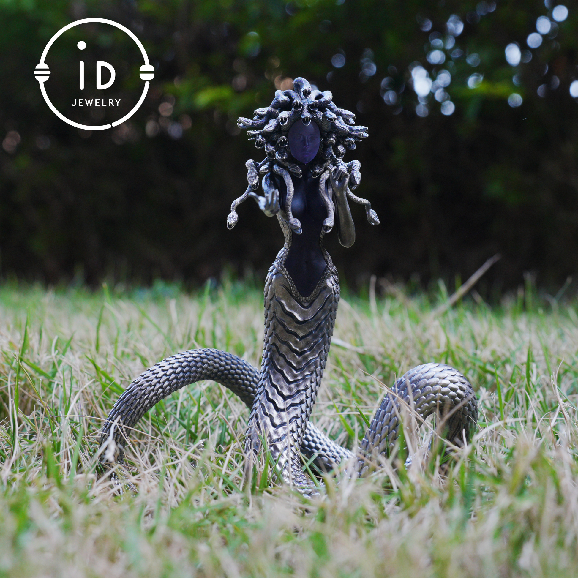 It symbolizes transformation, layered emotions, and the inner eye. The amethyst stands for clarity of mind, the serpent body for cyclical self.