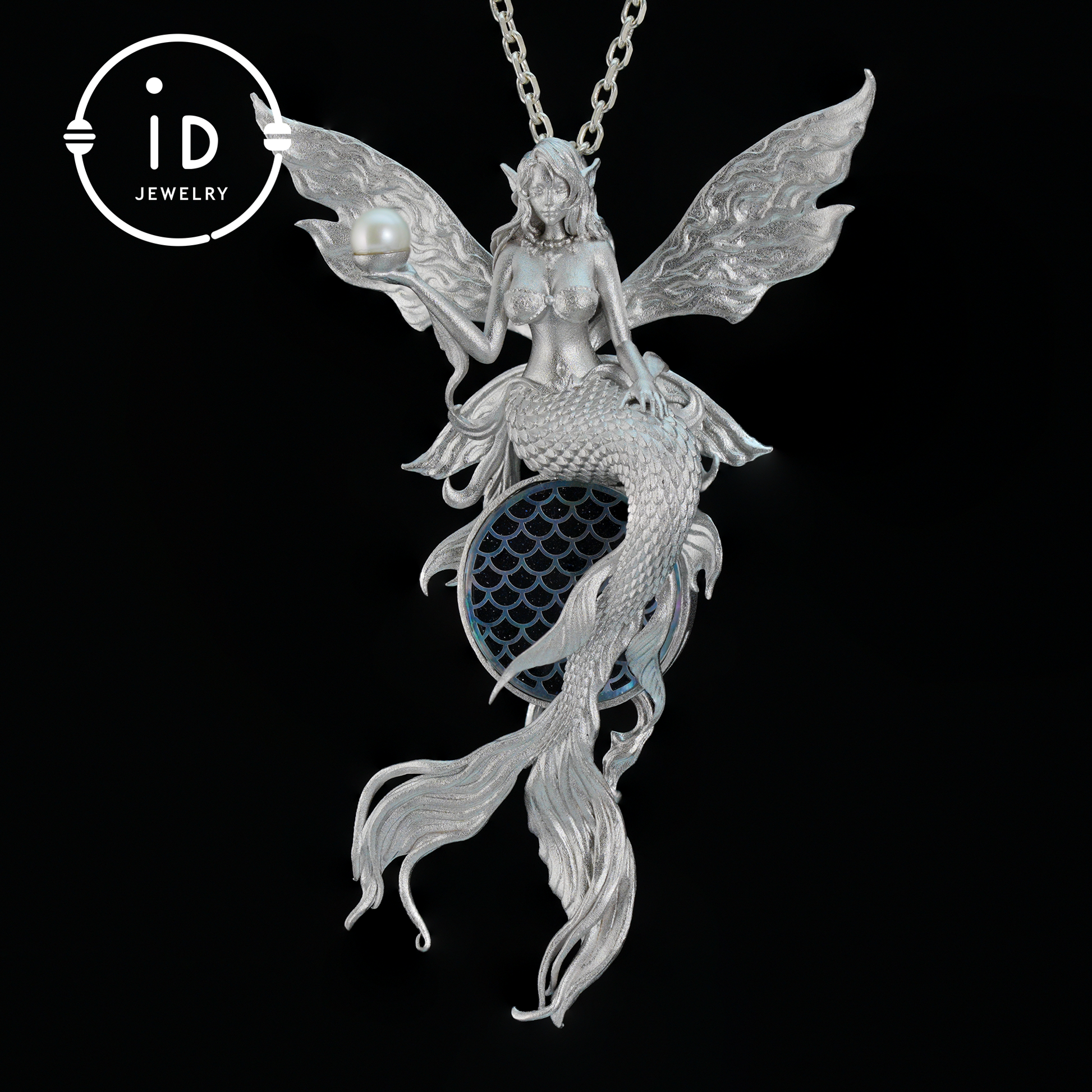 Her wings represent spiritual freedom, while the flowing mermaid tail expresses adaptability. The pearl in her hand stands for clarity, and the blue goldstone reflects the cosmic ocean and hidden knowledge.