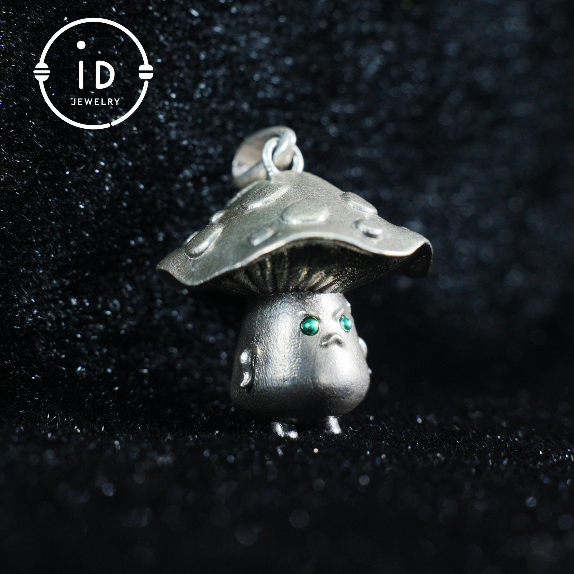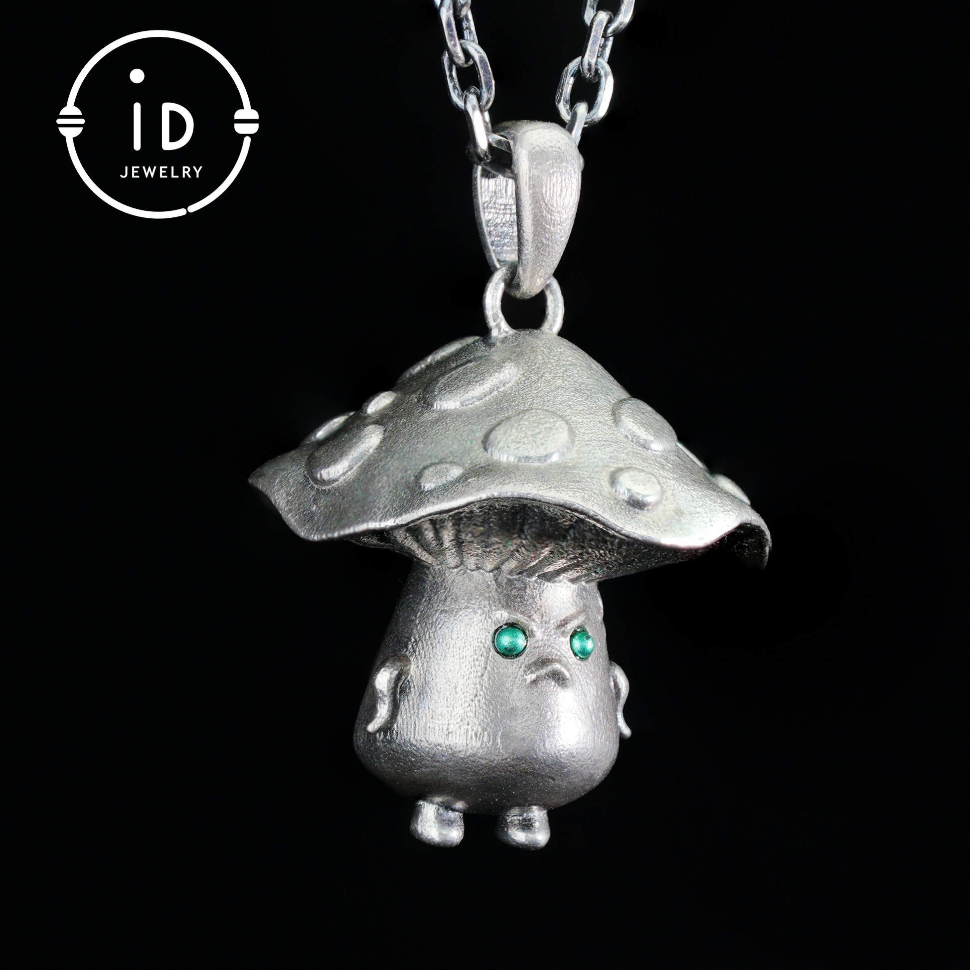 Pilzanhänger aus Sterlingsilber mit grünen Edelsteinaugen – Halskette mit Fantasie-Waldwesen – Süßes Schmuckgeschenk zur emotionalen Unterstützung