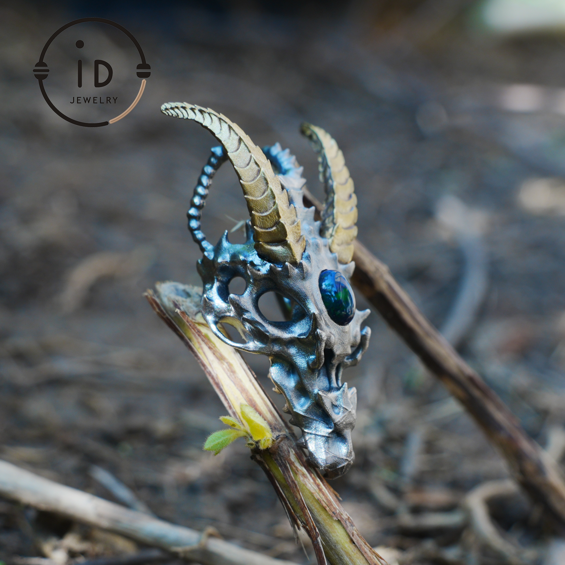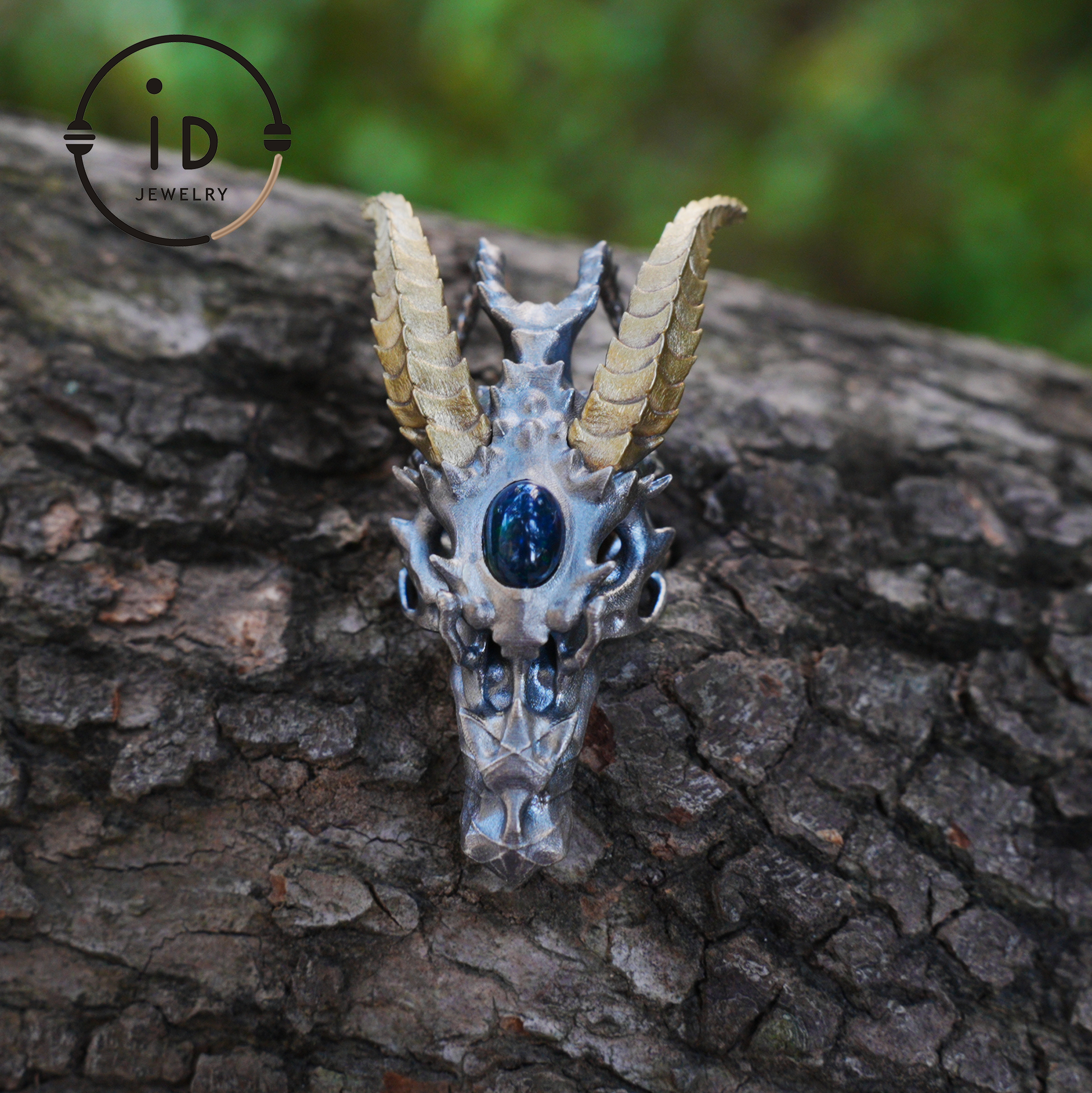 Sterling silver pendant with opal eye dragon head and golden horns in gothic totem style gift for him or fantasy lovers
