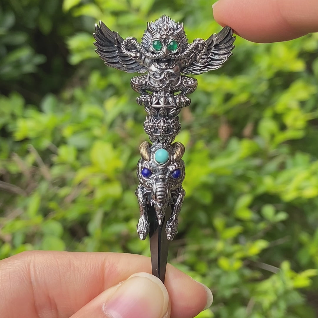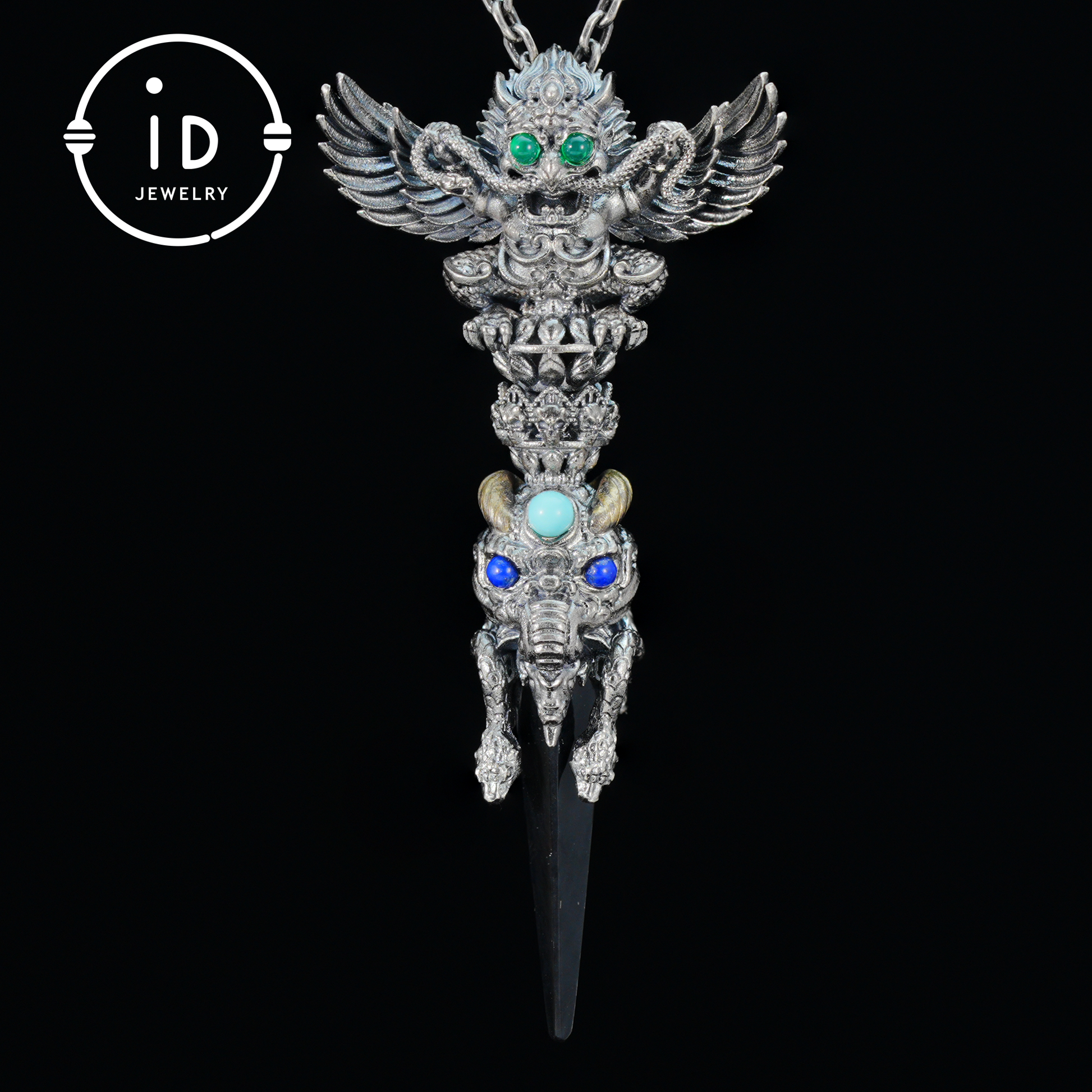 This handcrafted totem pendant made of oxidized 925 silver combines symbolic structure with archaic strength. The combination of black onyx, green chalcedony, lapis lazuli, and turquoise creates a balance between darkness and light, movement and stillness. Worn as a pendant, it functions as a personal talisman, supporting presence, focus, and inner stability. It is ideal for those who choose jewelry as a reflection of inner awareness rather than pure decoration.