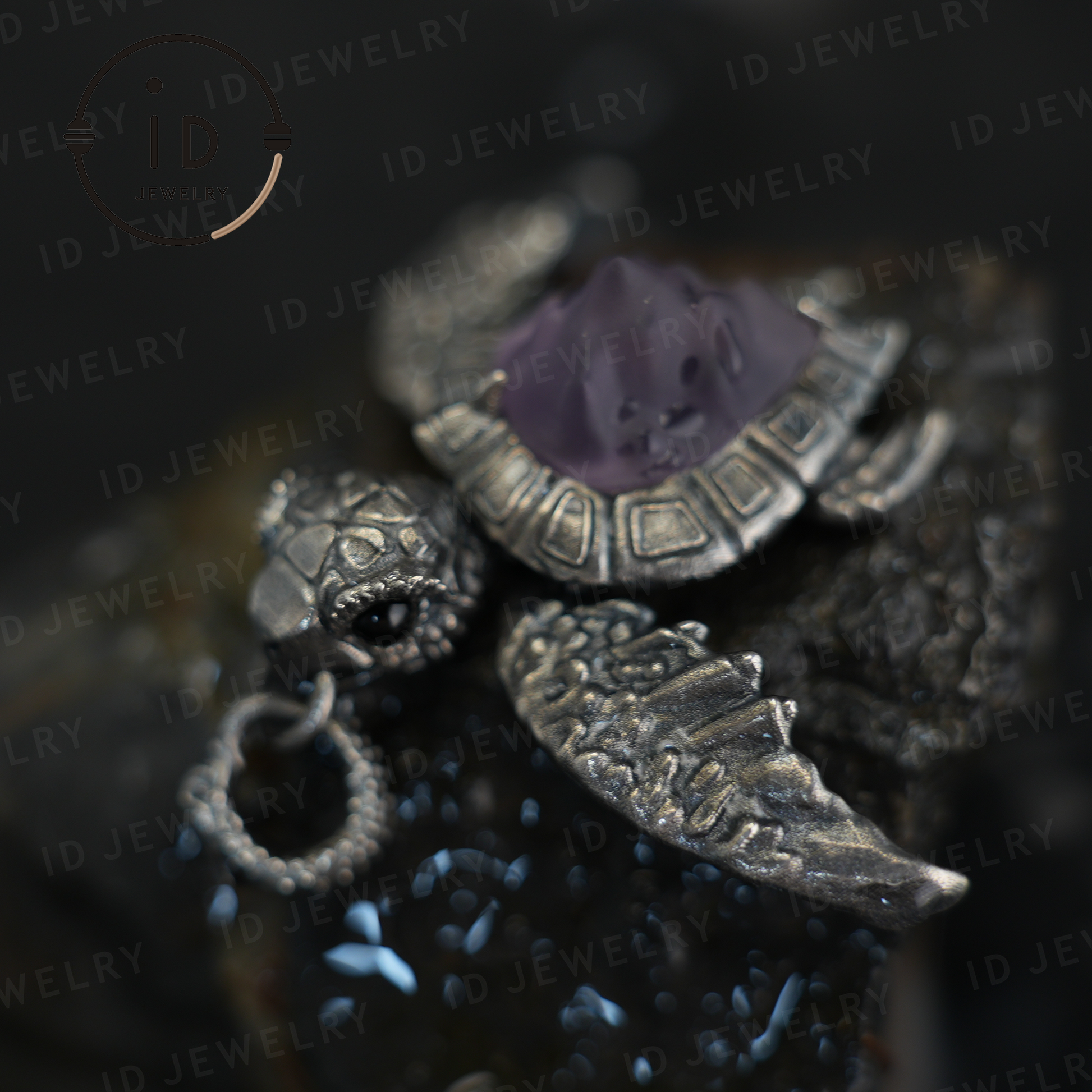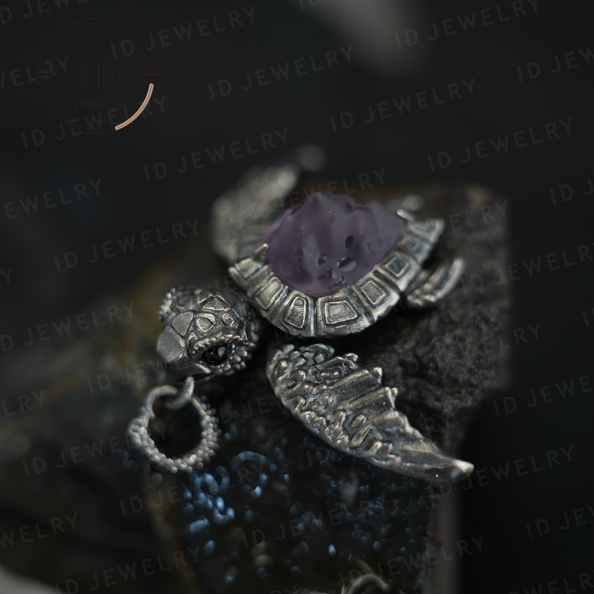 Hergestellt aus robustem Silber, natürlichem Amethyst und Achat. Jedes Detail ist mit Sorgfalt geformt, von den strukturierten Flossen bis zur Edelsteinschale – eine Kombination aus Fantasie und feiner Kunstfertigkeit.