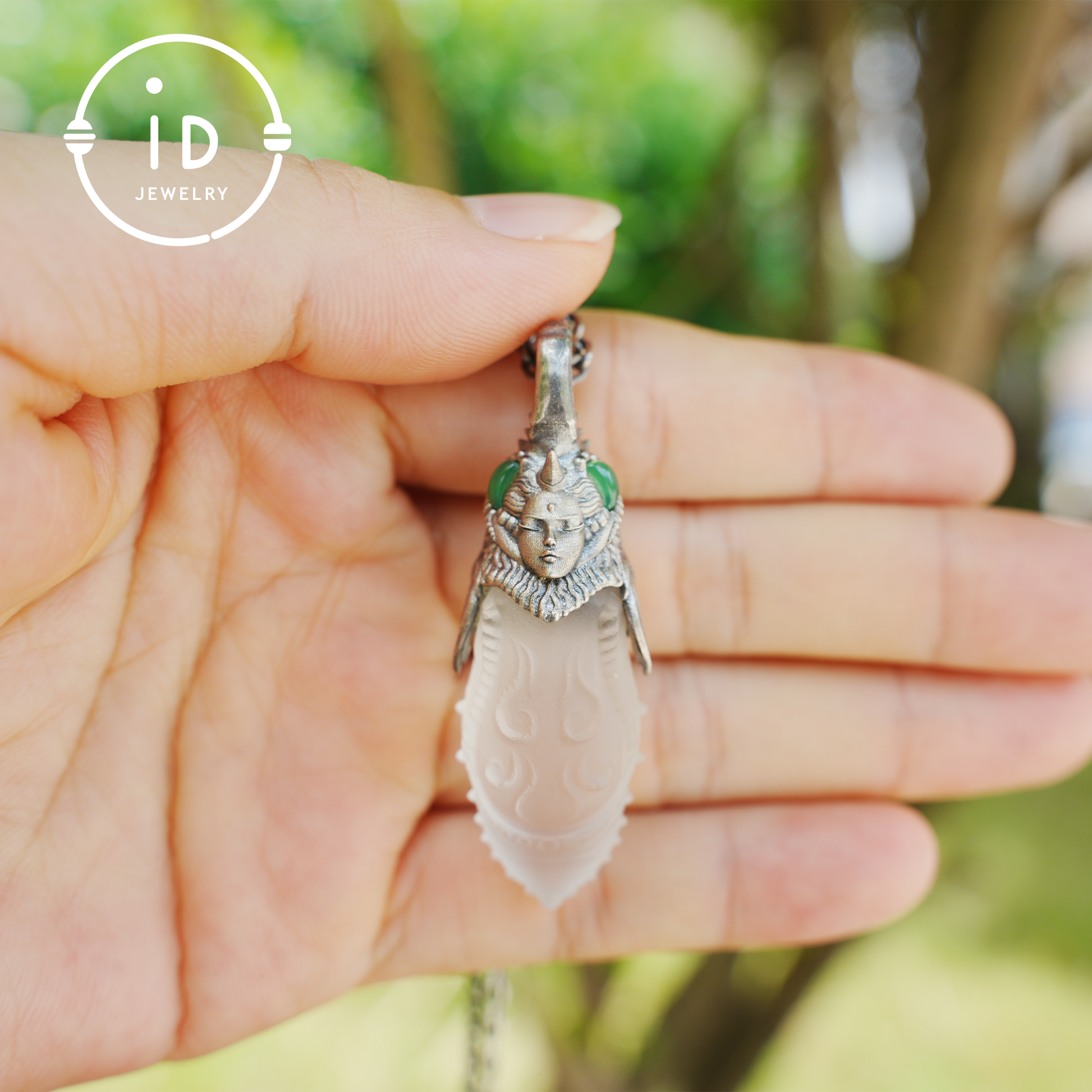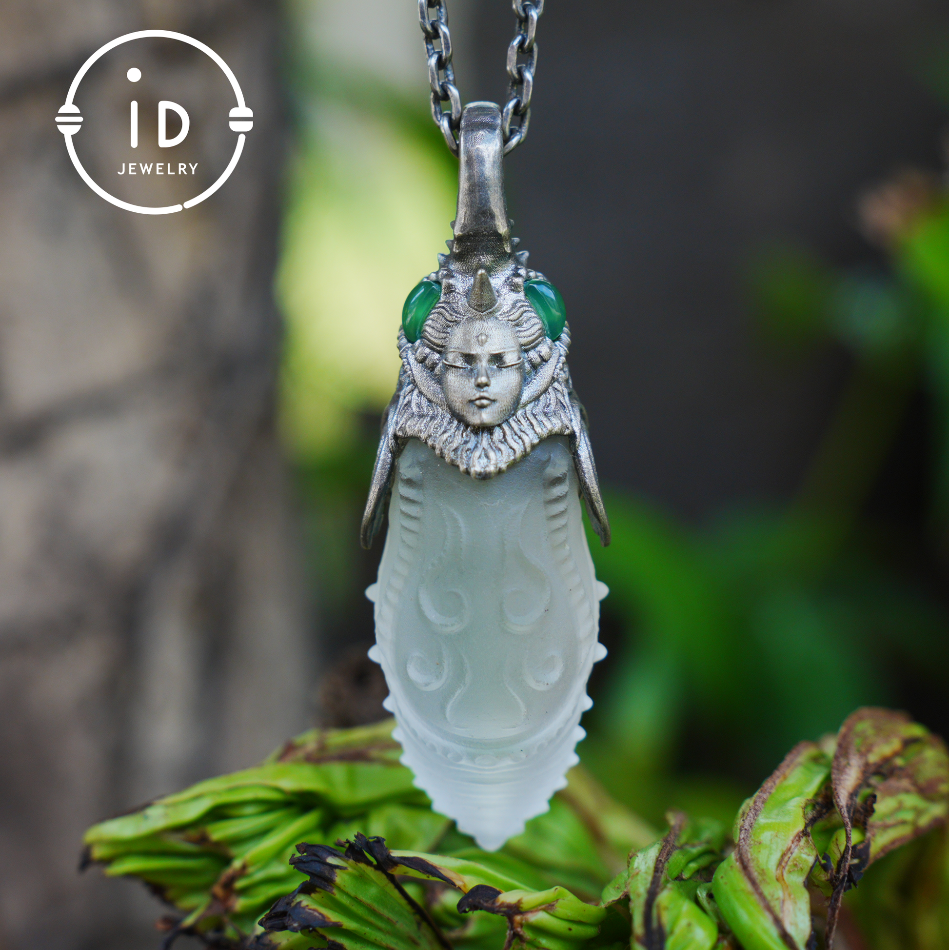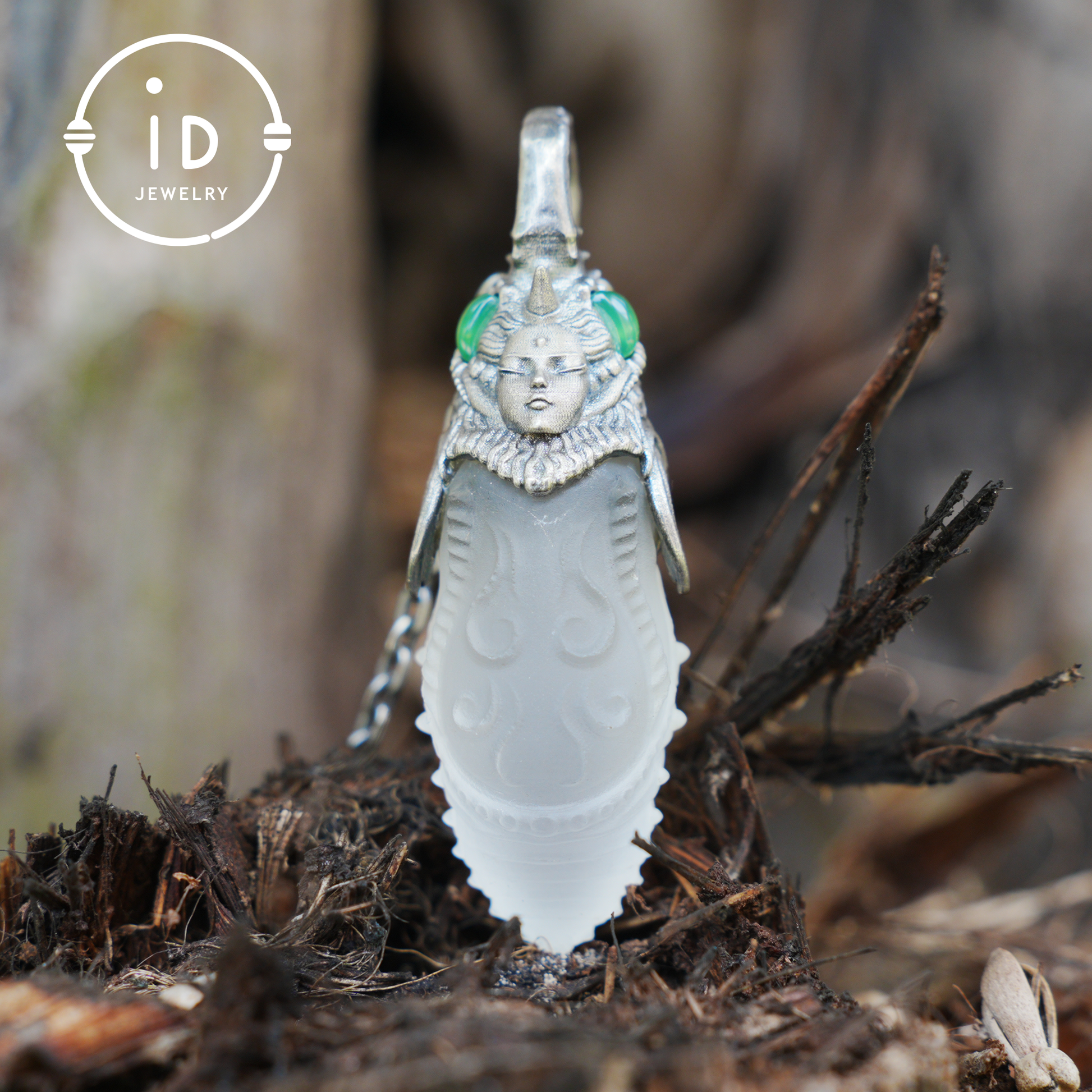 In this mystical pendant, symbolic power, transformation and craftsmanship come together. The oxidized head of a symbolic figure rests atop a hand-carved rock crystal body. Its organic form and frosted texture convey the idea of transition, inner change and balance. The green chalcedony stones on each side radiate calm. This piece is not only a striking accessory, but also a symbolic companion for those on a personal journey.