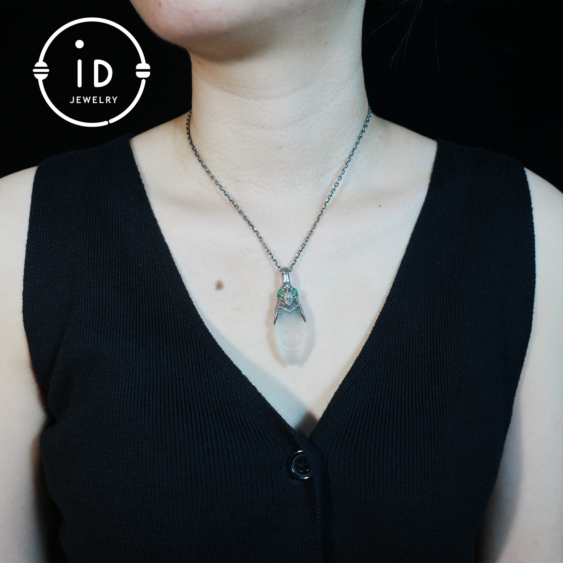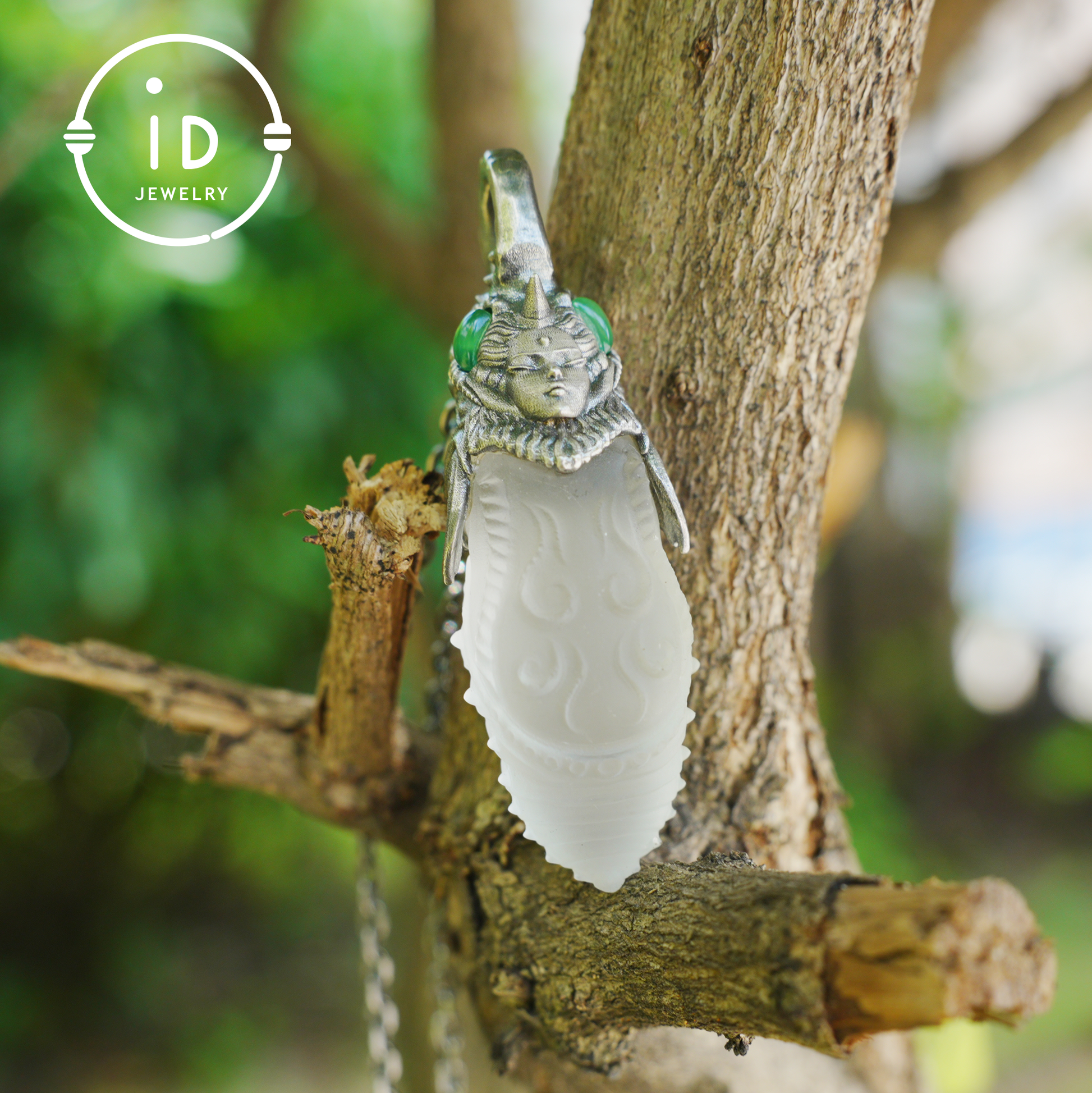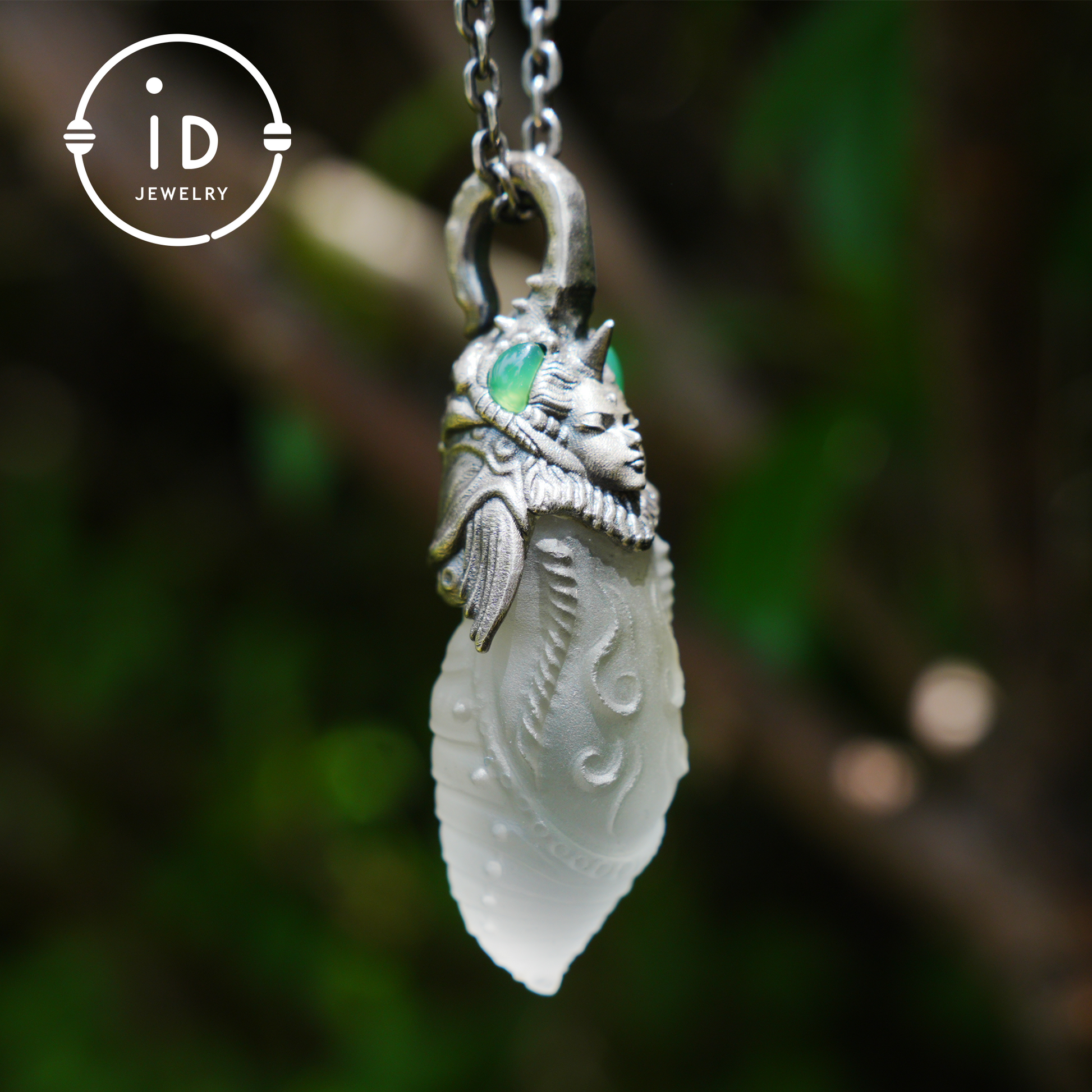 In this mystical pendant, symbolic power, transformation and craftsmanship come together. The oxidized head of a symbolic figure rests atop a hand-carved rock crystal body. Its organic form and frosted texture convey the idea of transition, inner change and balance. The green chalcedony stones on each side radiate calm. This piece is not only a striking accessory, but also a symbolic companion for those on a personal journey.