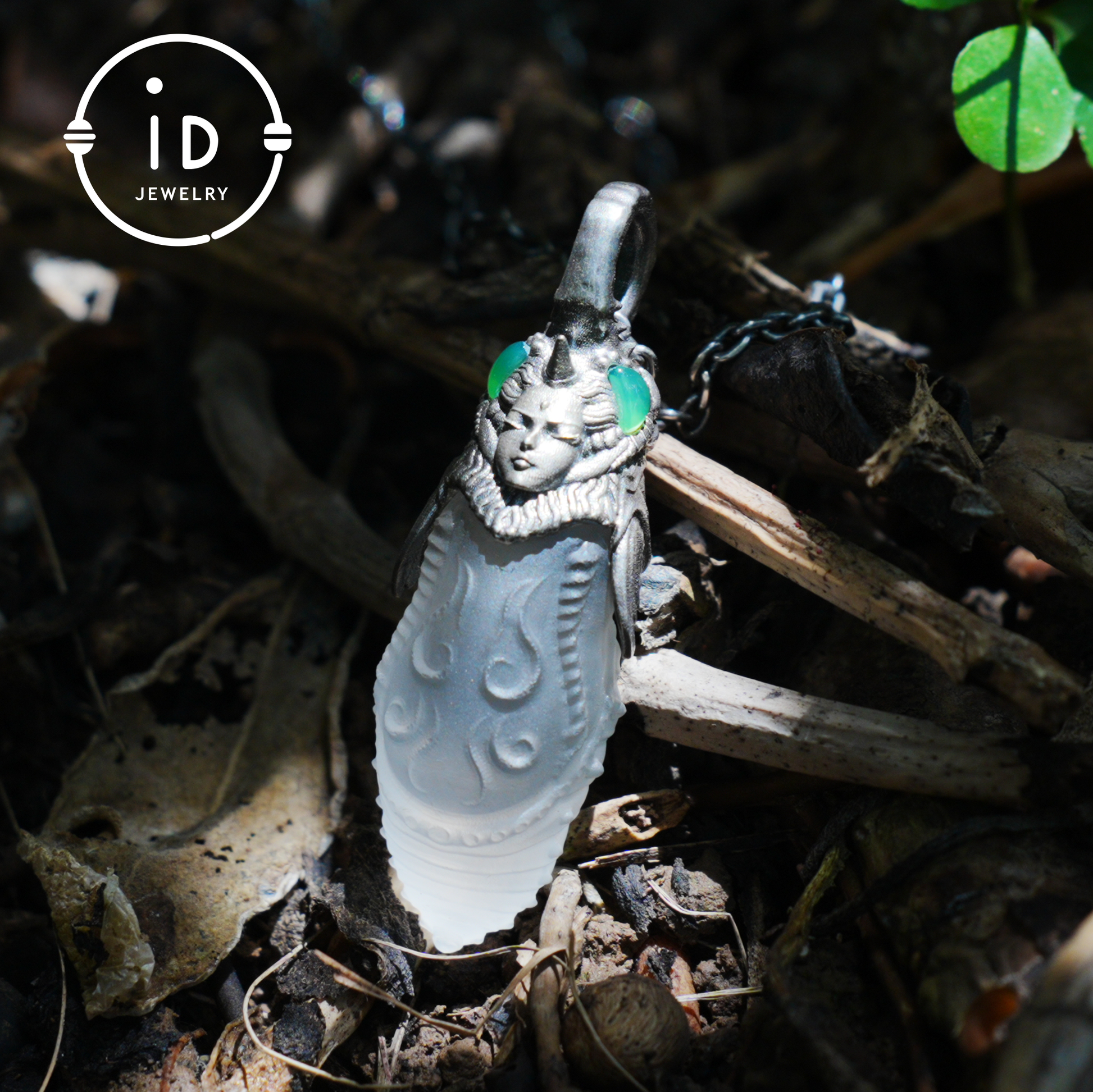 3D sculpted face, side-set chalcedony, matte ornamented crystal surface, fully handmade