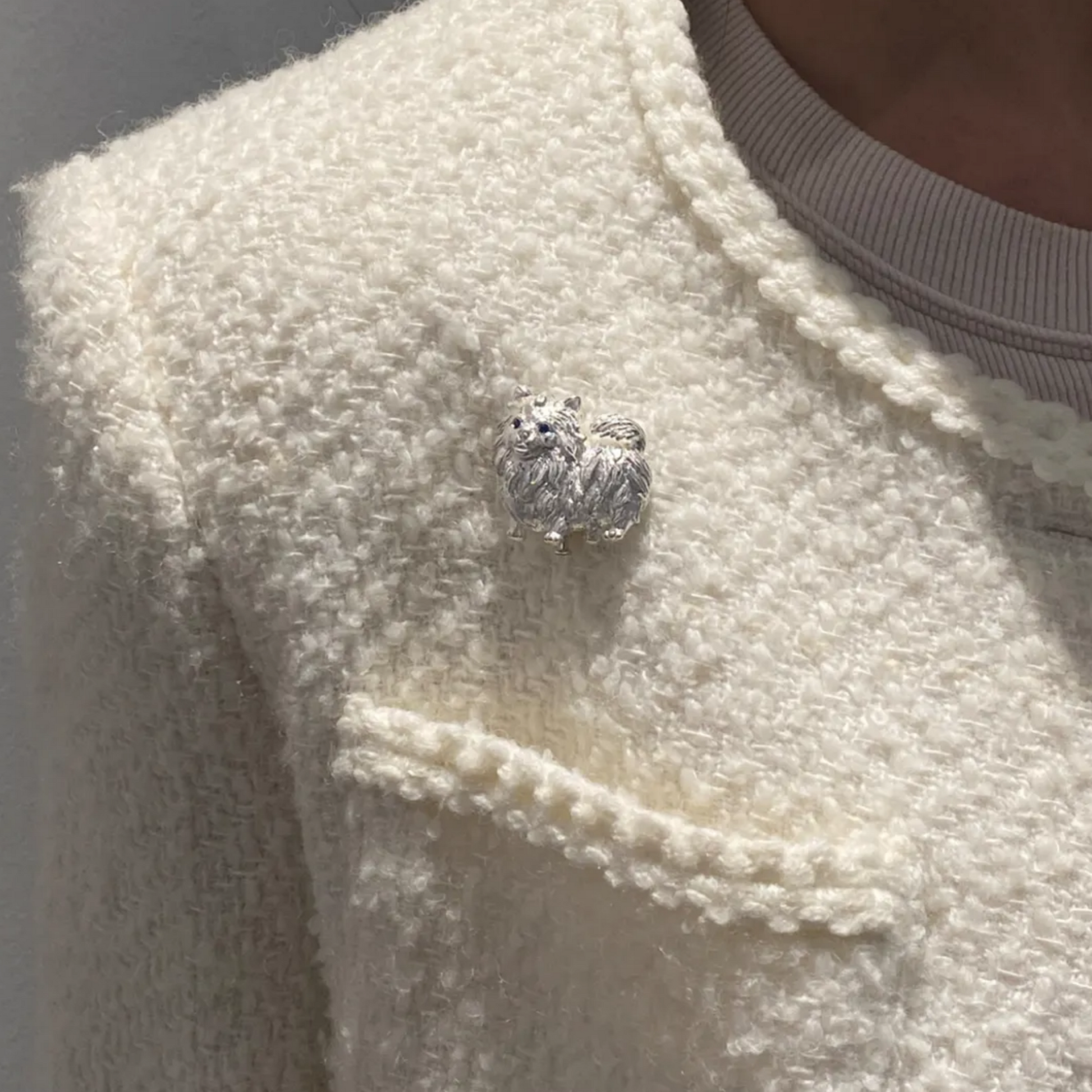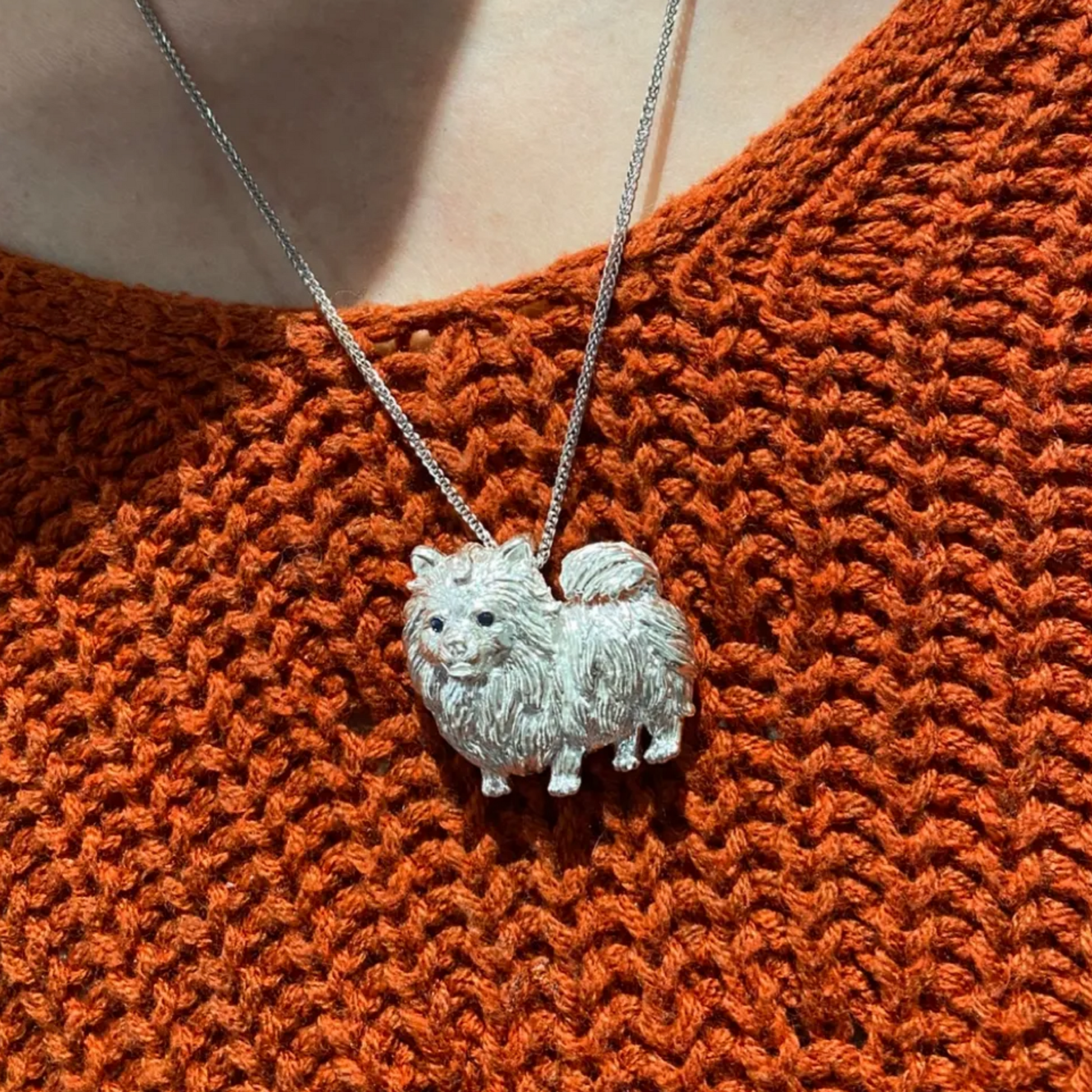 “Loyal Heart Pomeranian” — a handcrafted 2-in-1 brooch and pendant, lovingly shaped in 925 sterling silver with deep blue sapphire eyes that sparkle with warmth and joy.