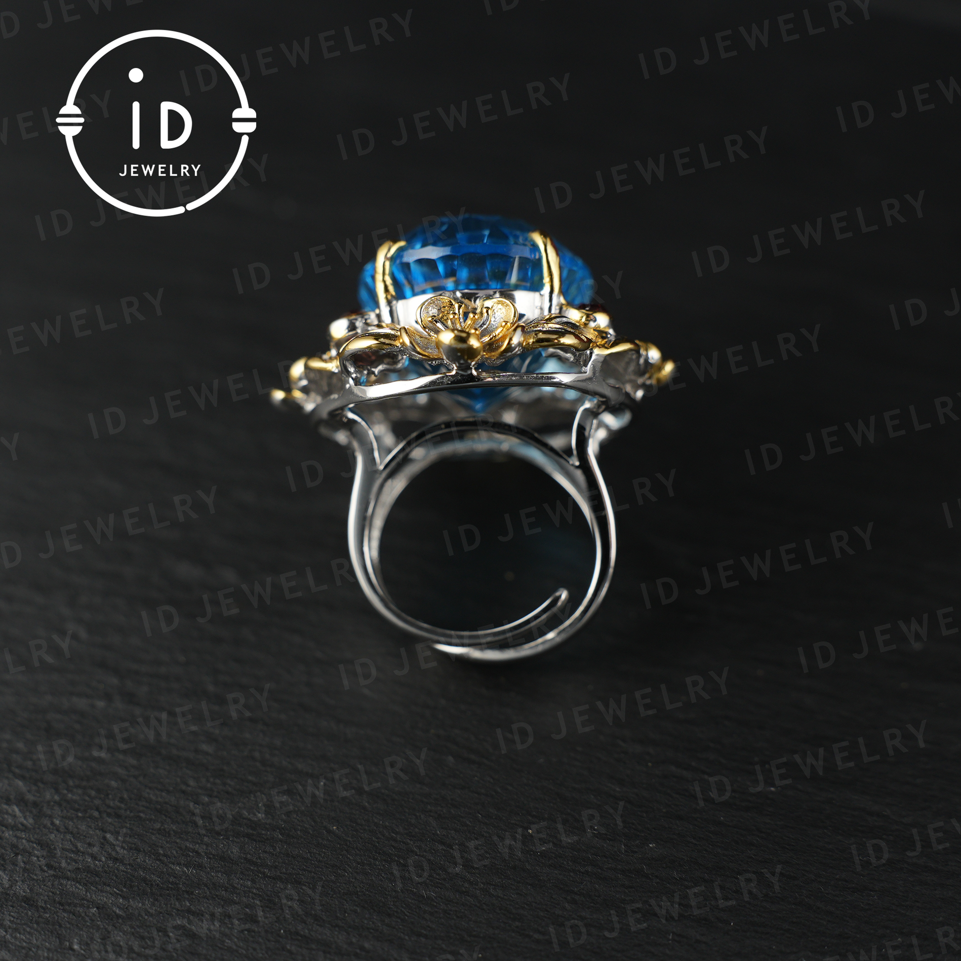 ✨ Ein wahrhaft königliches Meisterwerk! Dieser handgefertigte Barockring vereint luxuriöse Eleganz mit exquisitem Design. Ein großer, schillernder Naturtopas in 925er Silber mit 18 Karat vergoldeten floralen Details macht ihn zu einem herausragenden Statement.