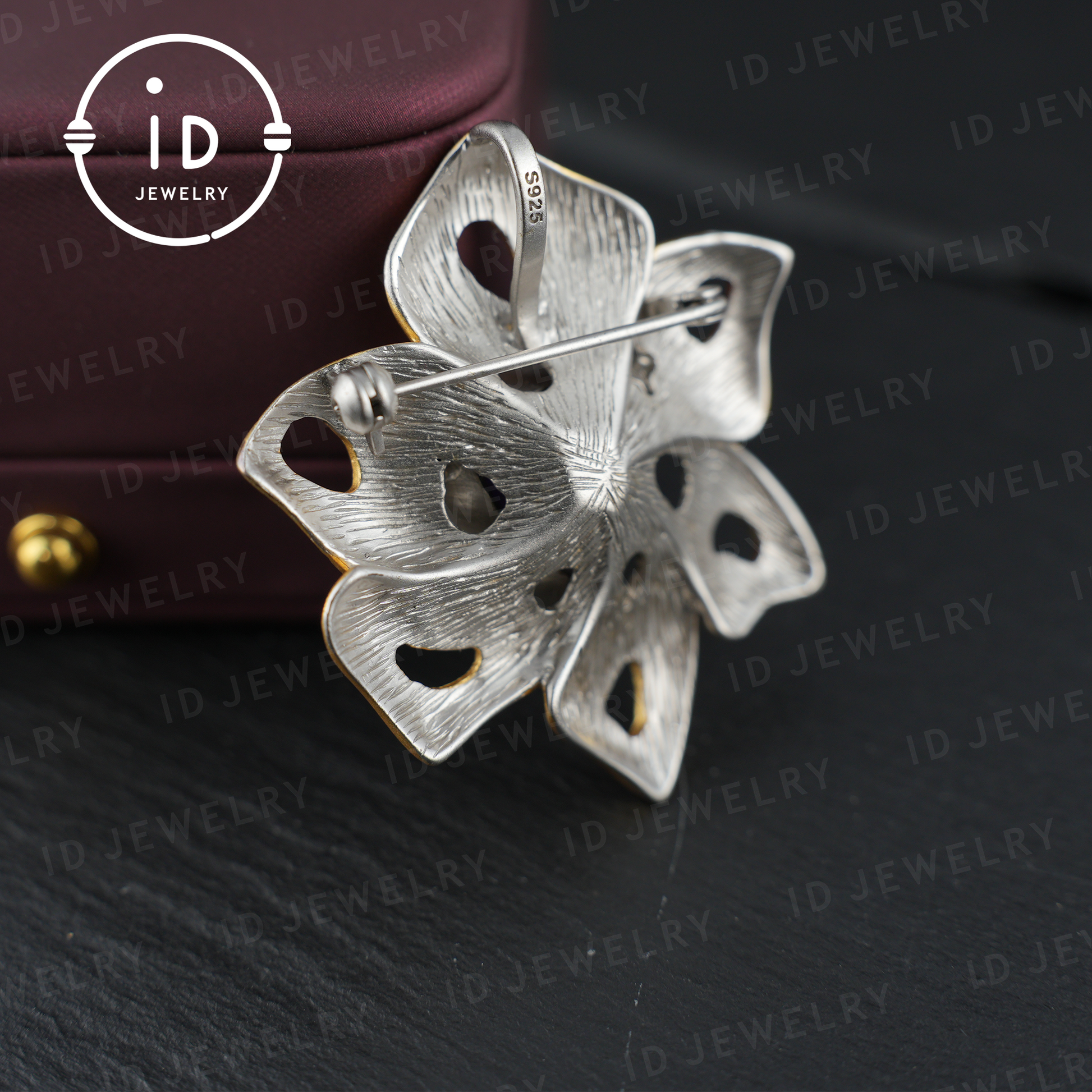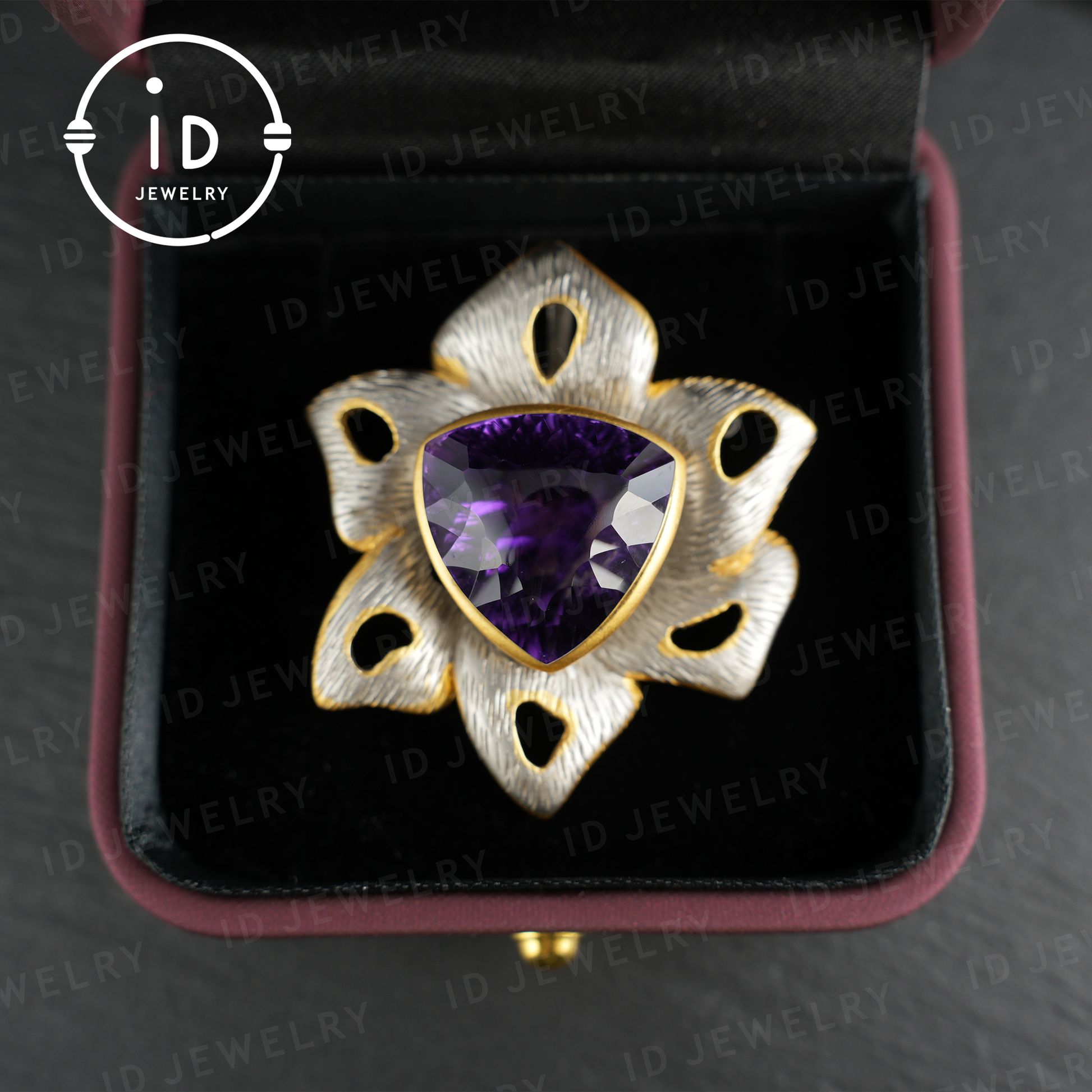 Diese exquisite Brosche ist aus hochwertigem Sterlingsilber (925) gefertigt und elegant mit vergoldetem 18-karätigem Gold veredelt. Das Herzstück ist ein atemberaubender natürlicher Amethyst in einem floralen Design, das von der Schönheit der Natur inspiriert ist.