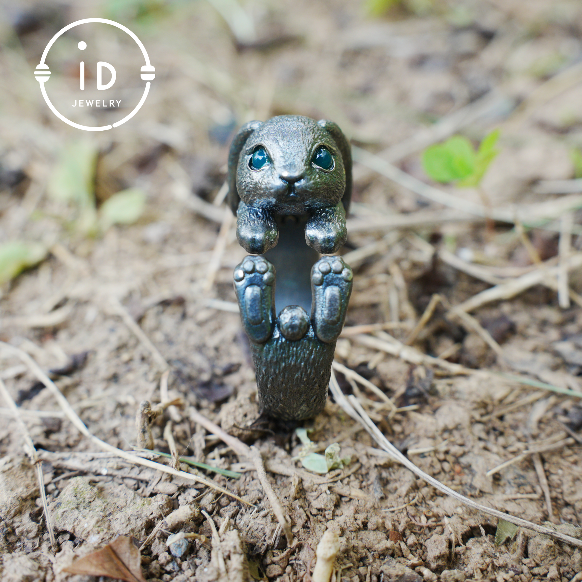 Handgefertigter Hasenring mit grünem Zirkon, Symbol des Frühlingserwachens, einzigartiger Silberschmuck