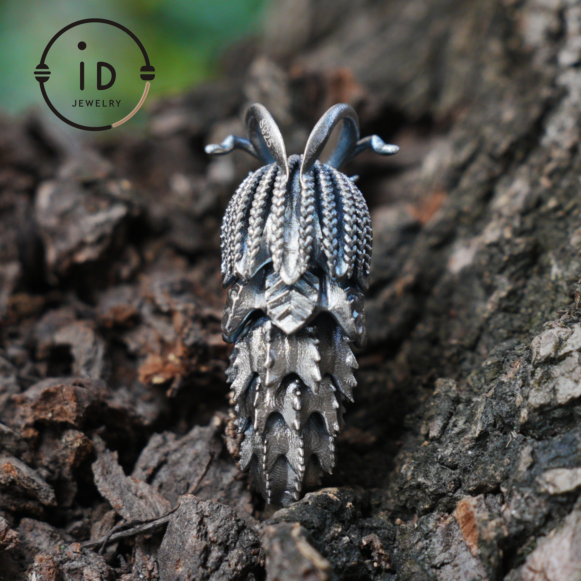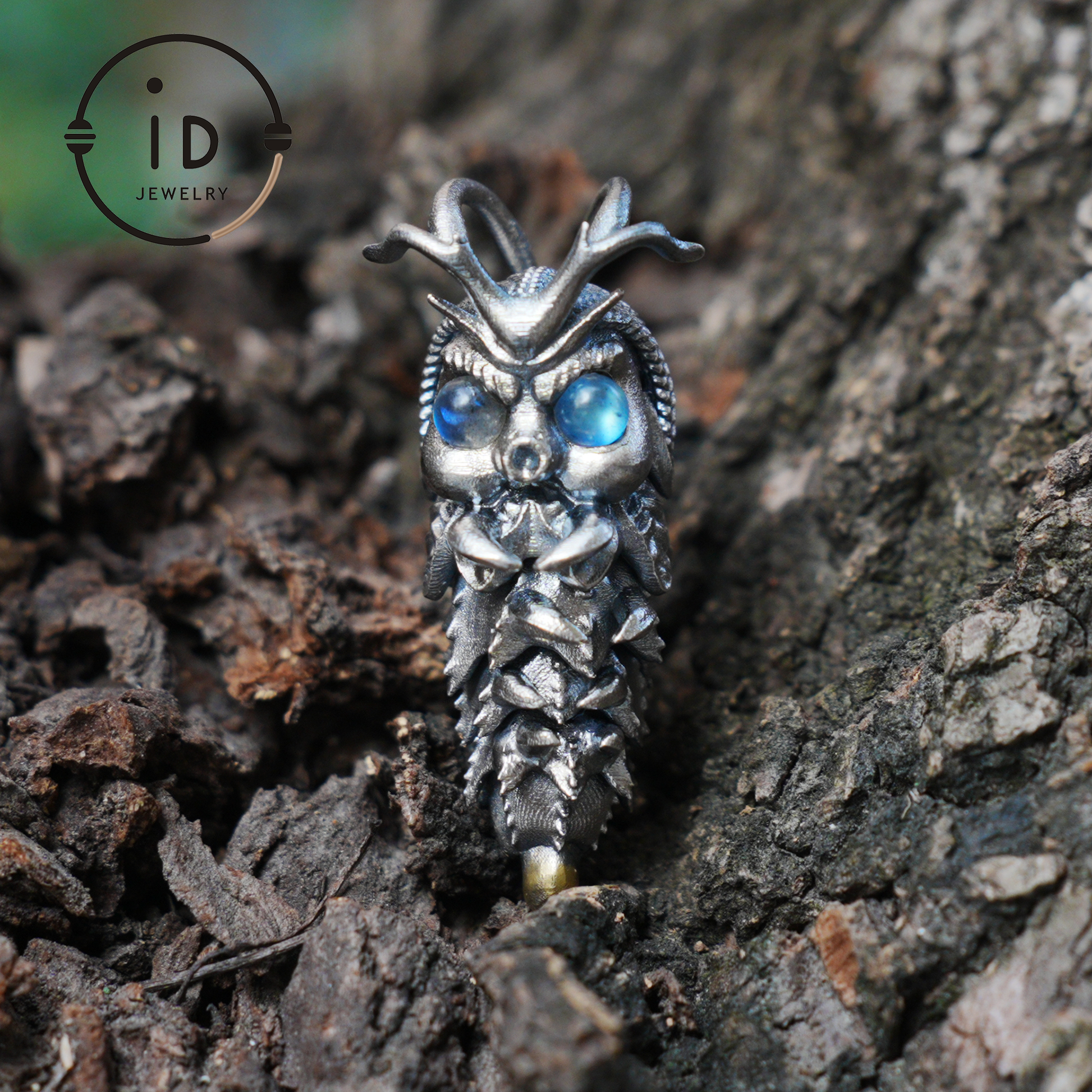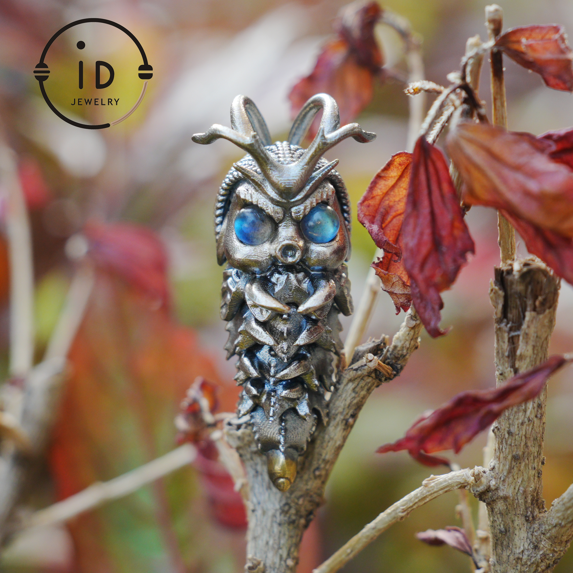 The segmented body symbolizes ongoing development, the insect shape stands for adaptability and awareness, and the labradorite eyes reflect perception and inner clarity.