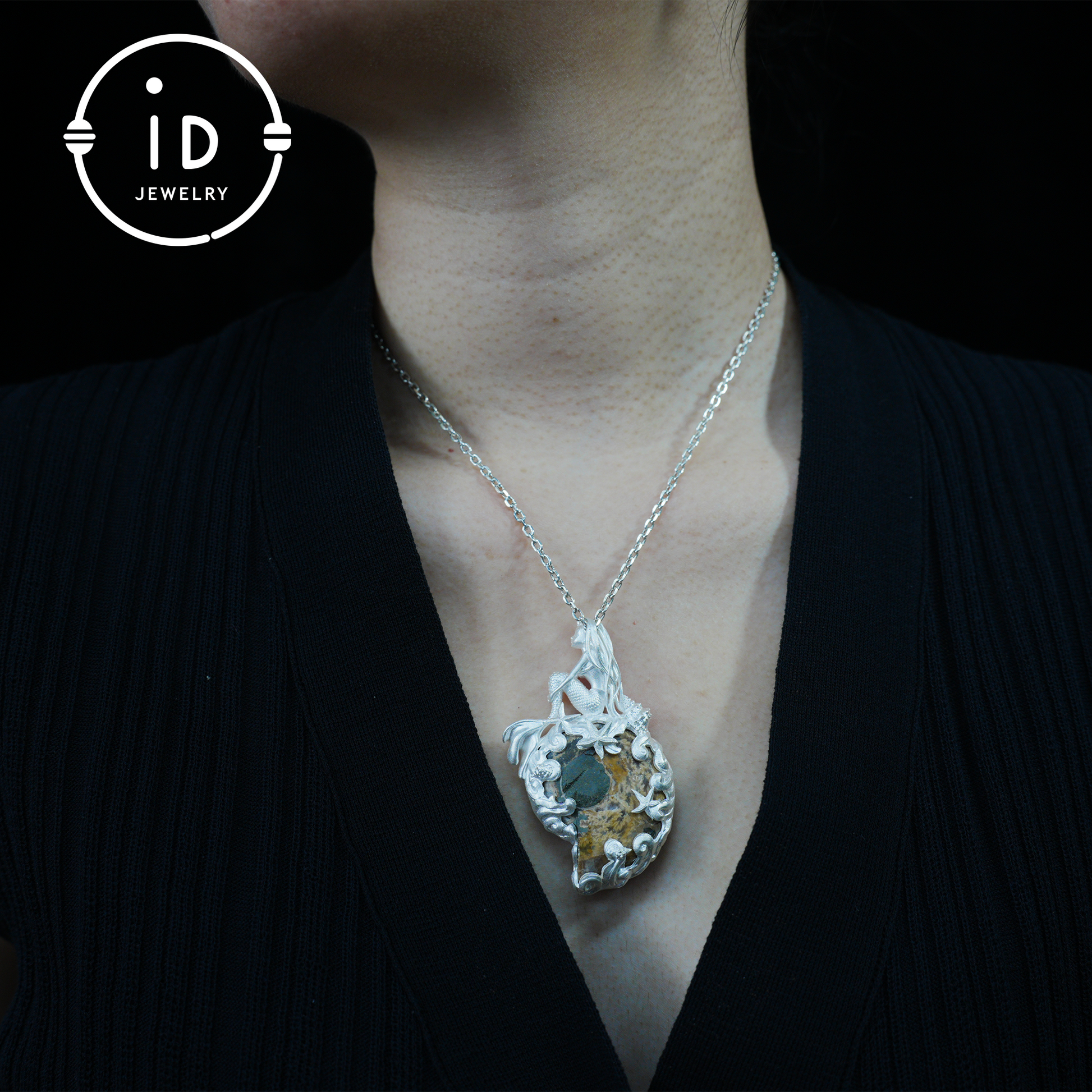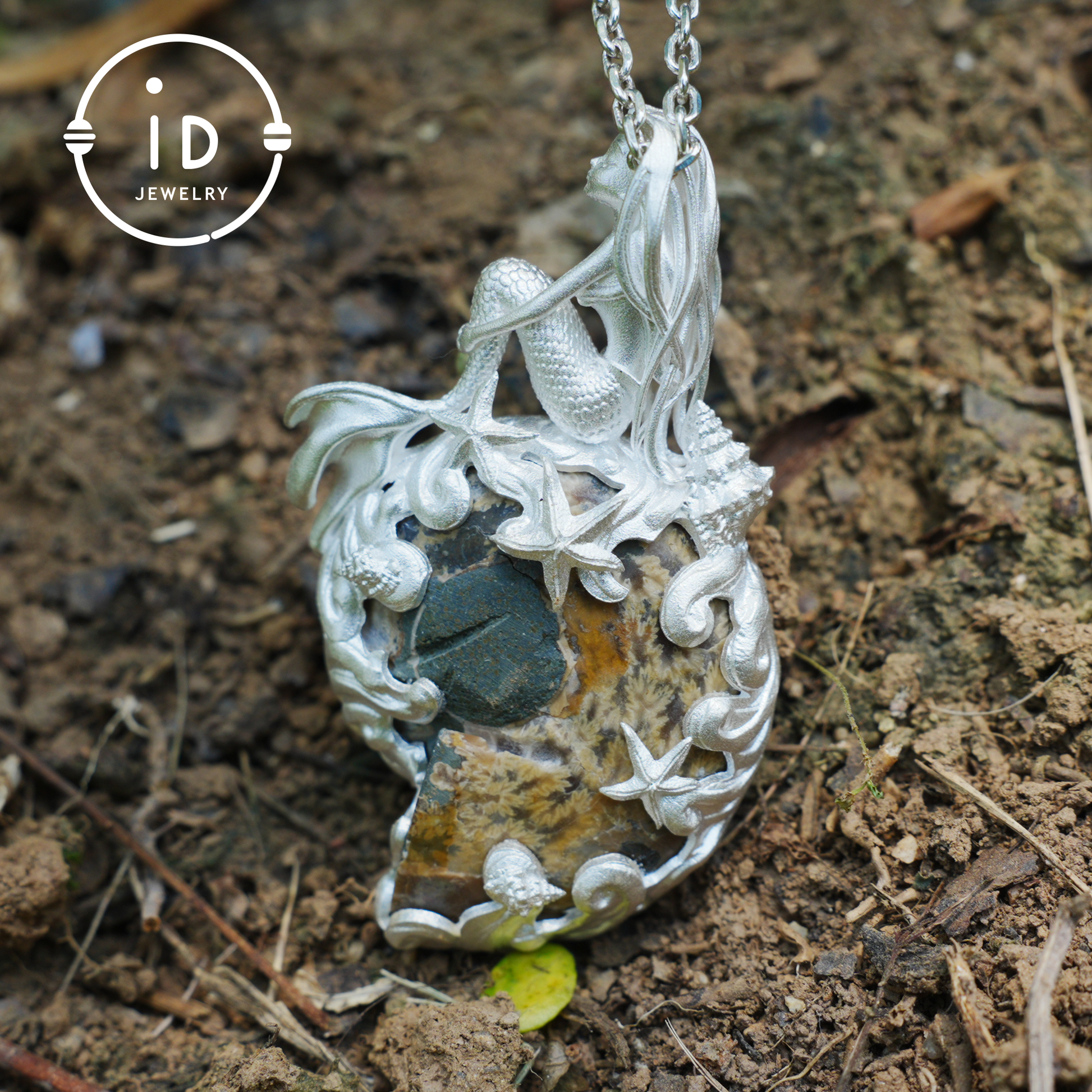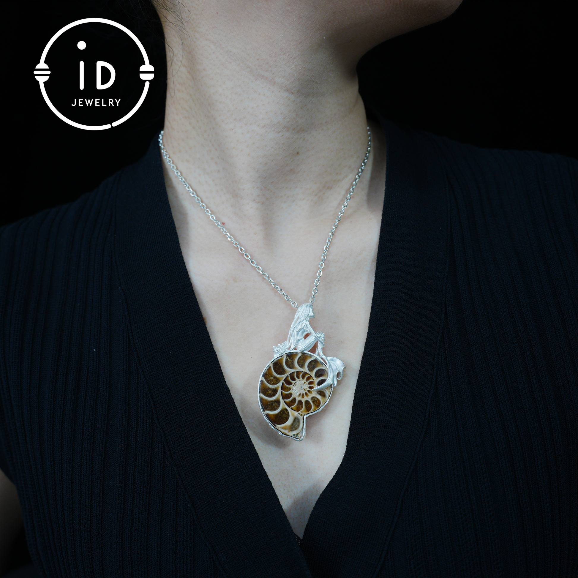 Meerjungfrau Muschel Fossil Anhänger, Handgefertigtes Meeresgöttin Amulett, Spiritueller Schutzschmuck, Mythisches Kunstdesign, Sirenenmeer Geschenk