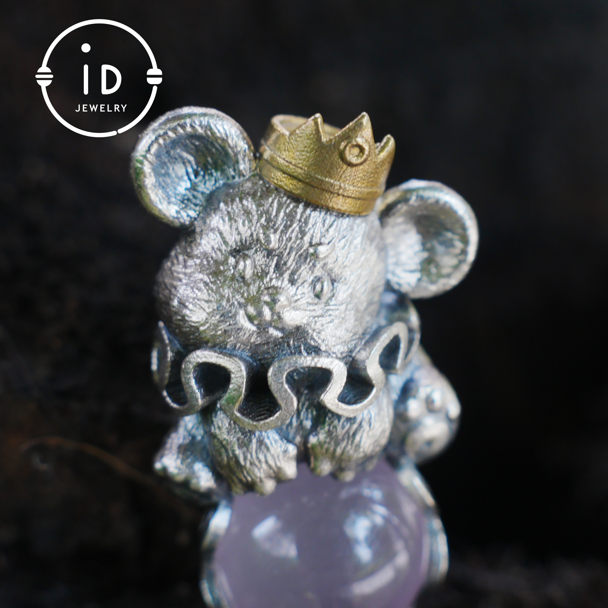 The mouse symbolizes agility and vigilance, the crown reminds us of everyone’s inner dignity, and rose quartz represents softness and inner peace. Together, they form a composition that conveys comfort and imagination.