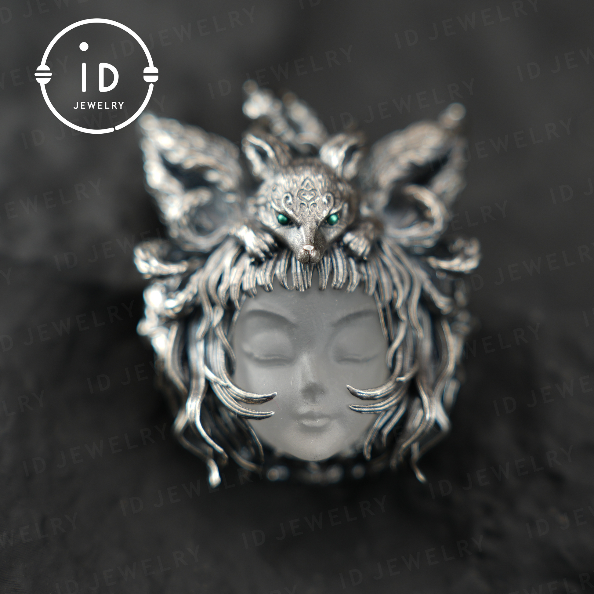 Dieser handgefertigte Anhänger besteht aus 925er Sterlingsilber und ist mit weißen Kristallen verziert. Das exquisite Design zeigt Engelsflügel, ein geheimnisvolles Gesicht und einen fein geschnitzten Fuchs, inspiriert von der antiken Mythologie und spiritueller Symbolik.