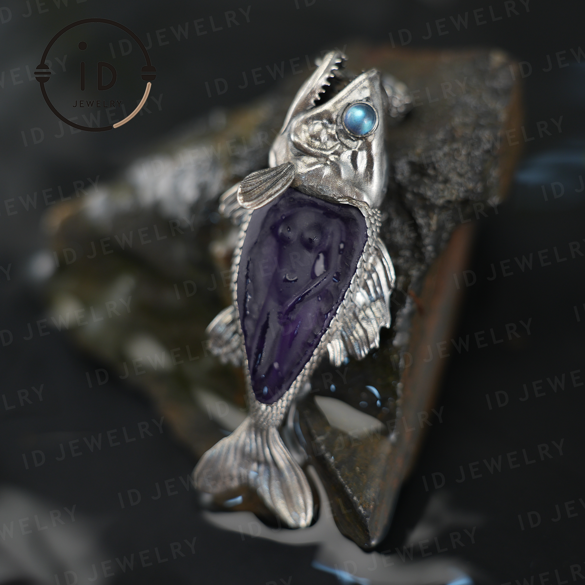 Ein dramatischer und kunstvoller Piranha-Anhänger, der fesselt. Mit einem violetten Amethystkörper mit einer eingravierten weiblichen Figur und einem leuchtenden Labradoritauge.