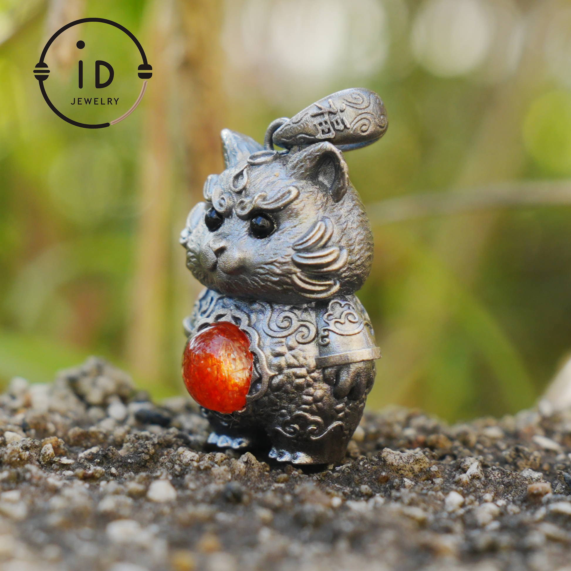 Its posture represents grounded strength, the forward gaze symbolizes clarity, and the sunstone set at the center suggests inner warmth. Black onyx details add visual depth and calm focus, while the textured silver surface reflects traces of time and experience.